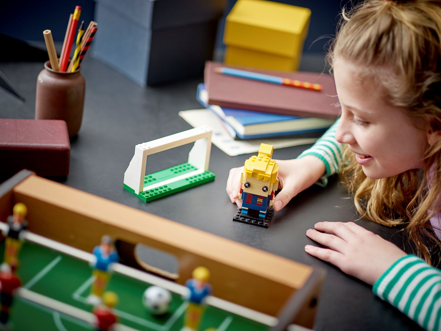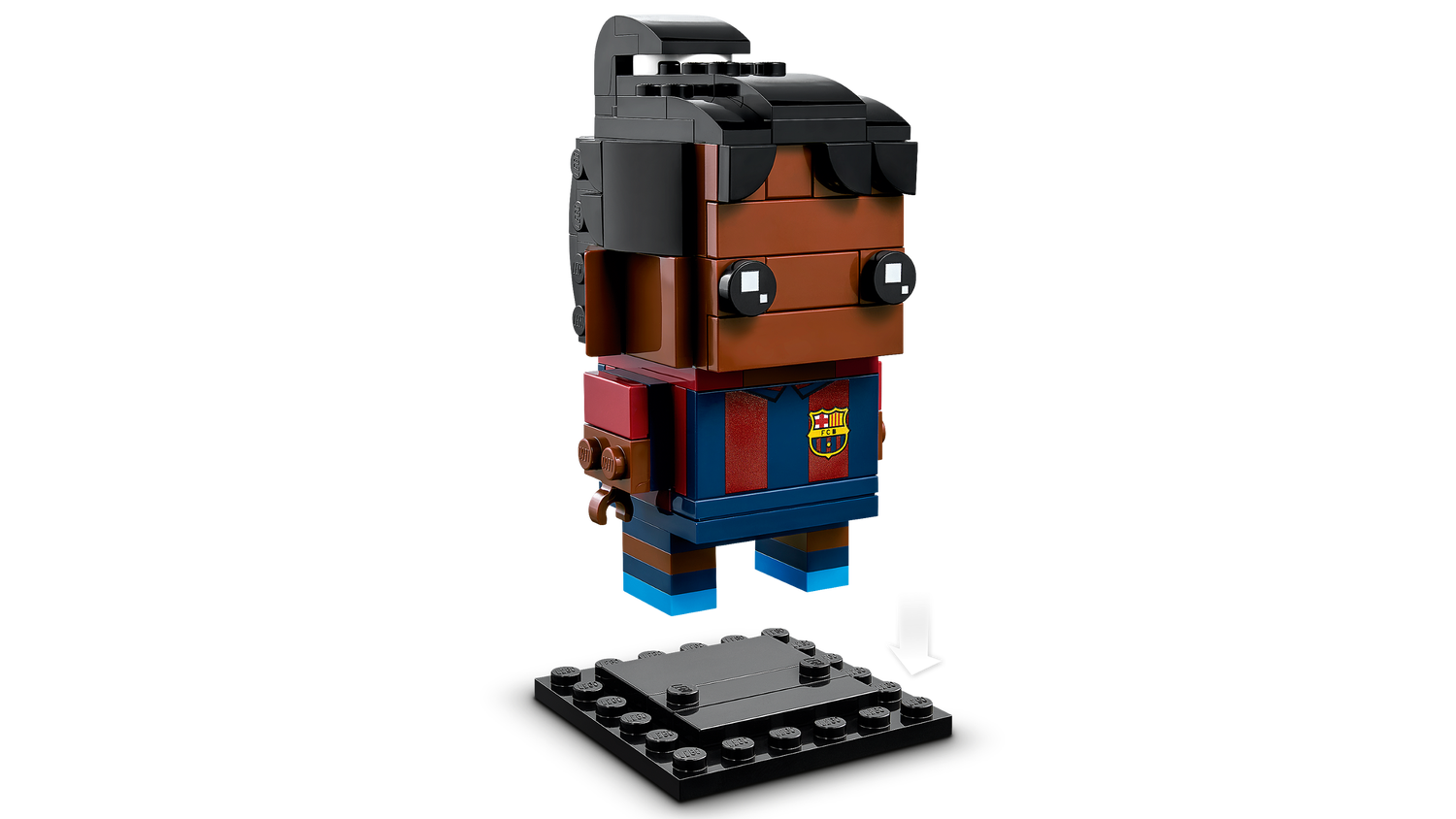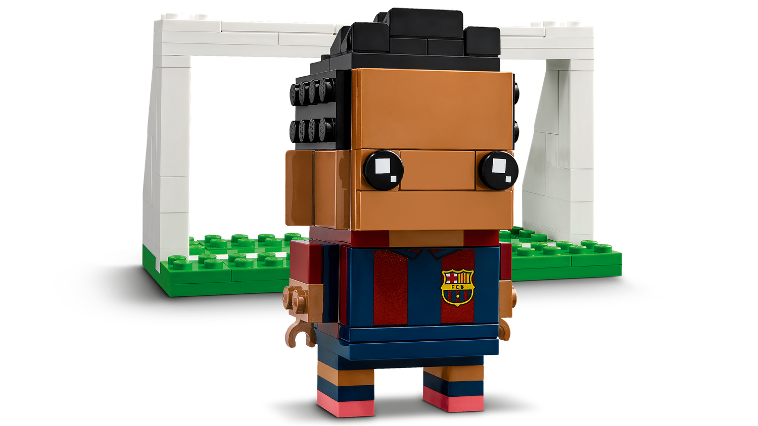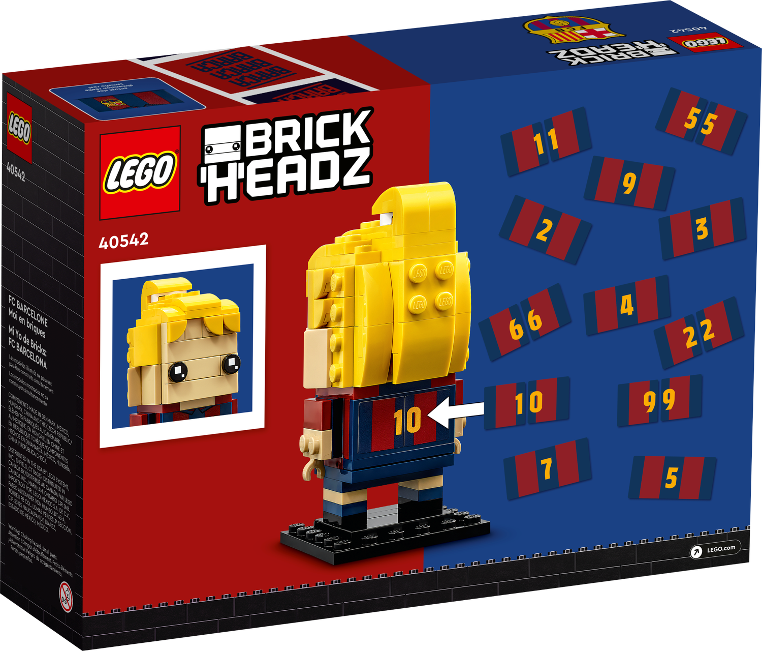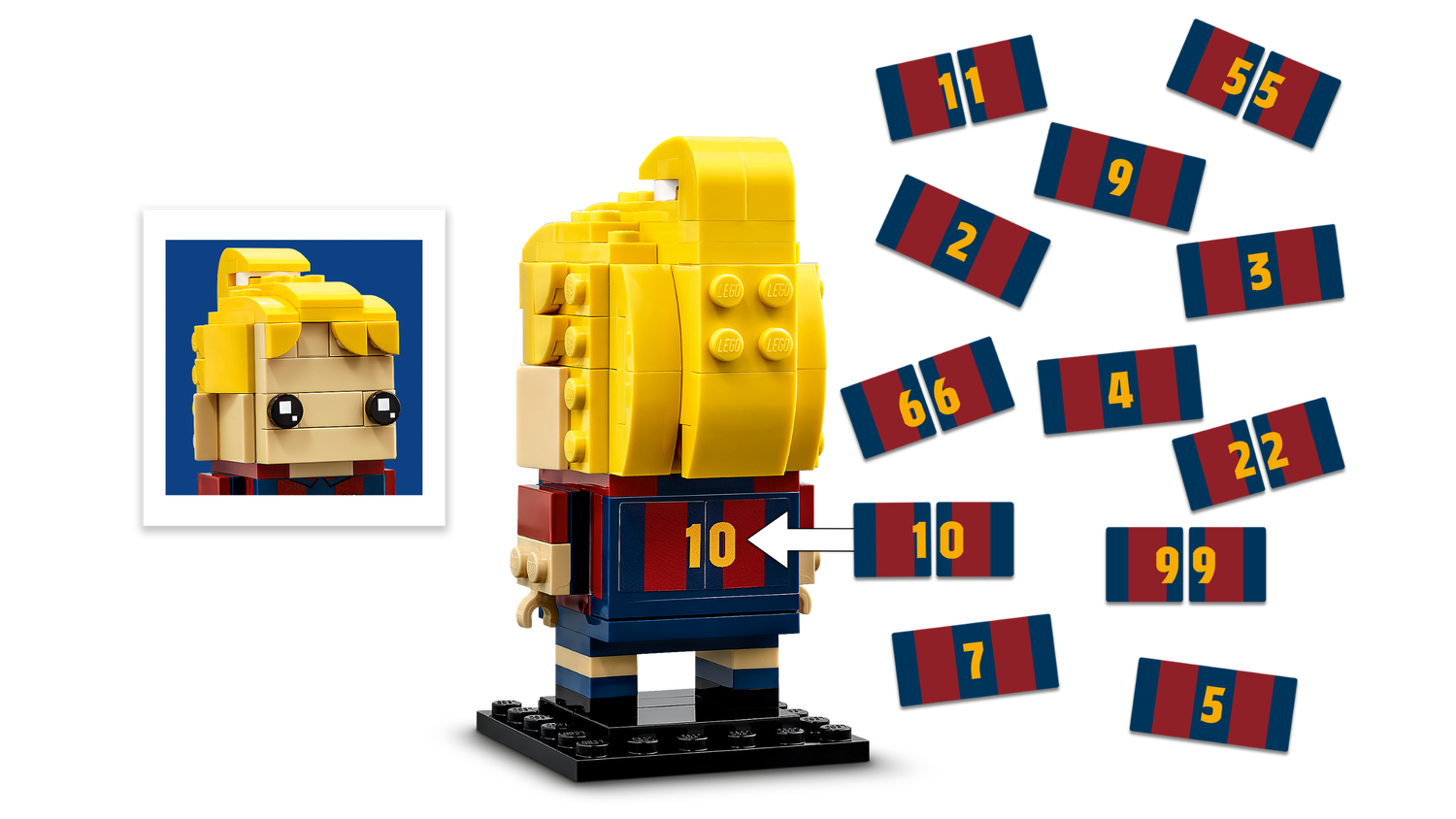 * Verwandle dich in einen Spieler des FC Barcelona – in LEGO® BrickHeadz™ Gestalt! Kinder ab 10 Jahren können ein Modell erschaffen, das sie selbst im Trikot eines der größten Fußballklubs der Welt darstellt* Wandlungsfähiges Modell: 3 verschiedene Hauttöne, 4 verschiedene Haarfarben und zahlreiche Frisuren stehen zur Wahl. 2 Bögen mit Aufklebern lassen dein Kind entscheiden, welche Nummer auf den Rücken des Trikots kommt* Modell zum Spielen und Ausstellen: Das Modell ist 8 cm groß. Ein kleines Tor und ein Fußball bieten Fans des FC Barcelona zusätzlichen Spielspaß*
