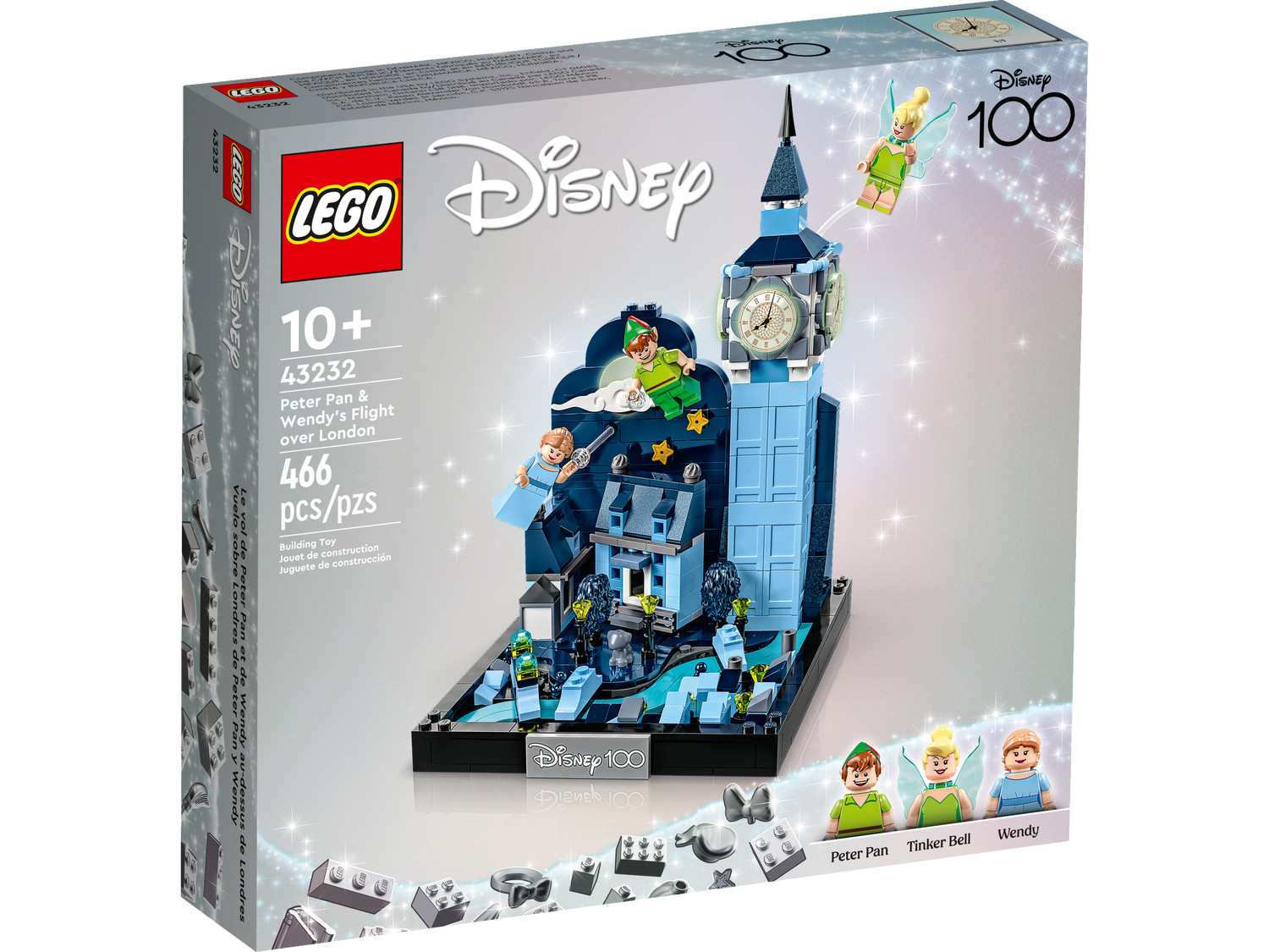 LEGO® ǀ Disney Peter Pans & Wendys Flug über London (43232) lässt Disney Fans ab 10 Jahren viele spannende Abenteuer am Nachthimmel über London darstellen. Das detailgetreue Diorama stellt die legendäre Flugszene aus dem Filmklassiker dar und besteht aus dem Big Ben in London mit 3 im Dunkeln leuchtenden Zifferblättern, einer Wolke mit Sternen, einem im Dunkeln leuchtenden Mond, Brücken über einen Fluss und einer Hundehütte. 3 LEGO ǀ Disney Minifiguren, ein LEGO Hund und eine Tafel mit der Aufschrift „Disney 100“ sind ebenfalls enthalten. Die LEGO Builder App bietet Kindern ein intuitives Bauabenteuer. Die darin verfügbaren Funktionen lassen dein Kind 3D-Ansichten der Modelle vergrößern und drehen, Sets speichern und seinen Baufortschritt verfolgen.Legendäre CharaktereDas Set zum Spielen und Ausstellen basiert auf dem Disney Filmklassiker Peter Pan. Das Modell lädt Kinder zu fantasievollen Abenteuern ein und hat nach dem Spielen einen Ehrenplatz im Regal verdient. Das Set beinhaltet auch 3 LEGO ǀ Disney Minifiguren – Peter Pan, Wendy und Tinker Bell – sowie den LEGO Hund Nana. Das Diorama ist ein tolles Geschenk für erwachsene Fans und ältere Kinder, die gern dem angesagtesten Trend folgen.