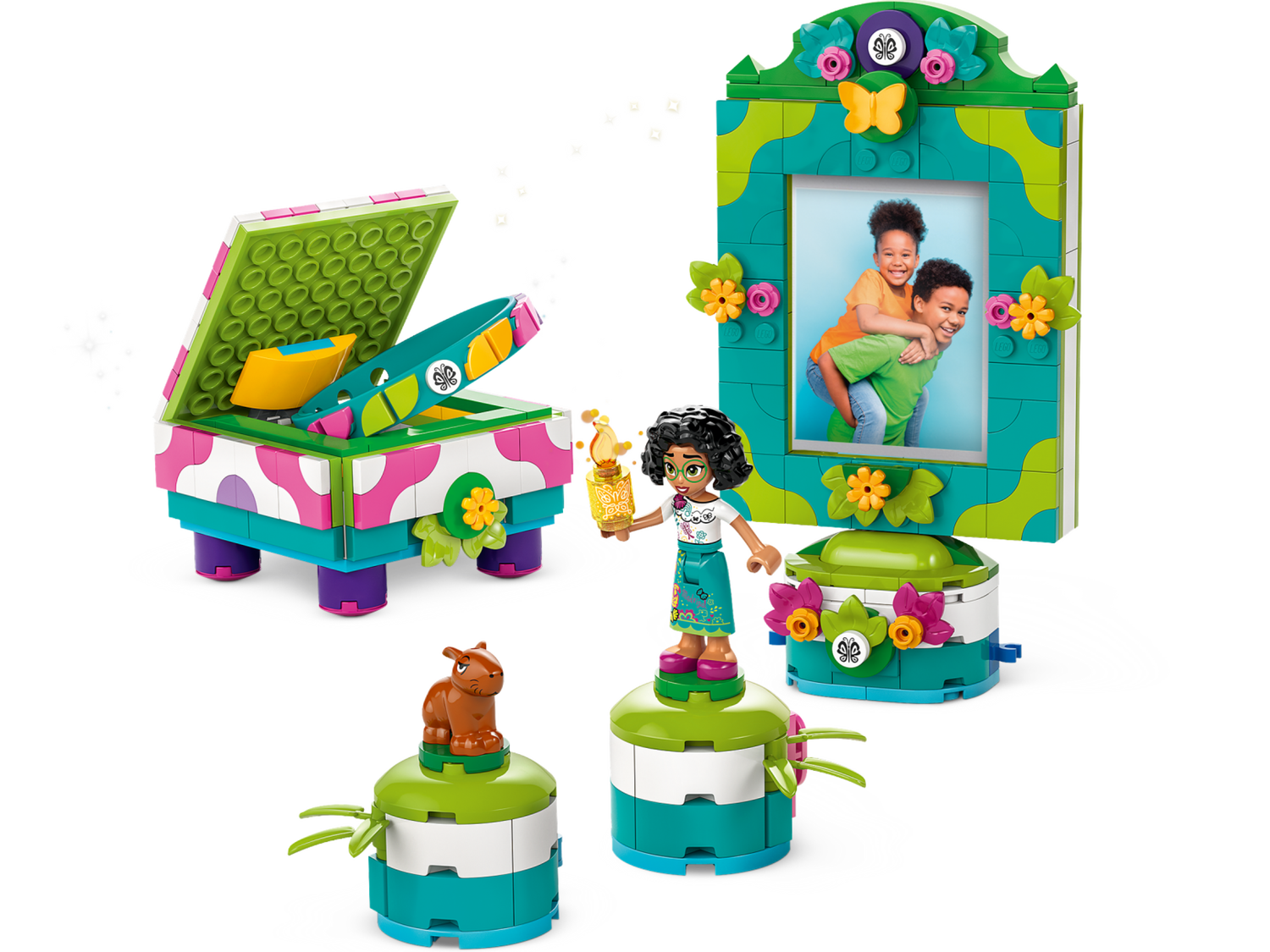 LEGO® ǀ Disney Encanto Mirabels Fotorahmen und Schmuckkästchen (43239) ist ein Bauspielzeug für Fans und Kinder ab 6 Jahren, die Disney Filme lieben. In dem Schmuckkästchen ist Platz für das beiliegende Armband. Und zum Fotorahmen gehört ein Ständer mit zusätzlichen Clips für kleine Fotos und 2 Bühnen für die LEGO ǀ Disney Spielfigur Mirabel und das LEGO ǀ Disney Wasserschwein.Dieses farbenfrohe Disney Bauset beinhaltet viele Teile und jede Menge Funktionen und Zubehörelemente, die Kinder kreativ bauen lassen. Das faszinierende Set ist ein tolles Geschenk für Mädchen und Jungen, die Kunst und Design lieben und sich nach einer neuen kreativen Aufgabe sehnen, bei der sie nach Herzenslust Modelle gestalten, umgestalten und verzieren können. Und die LEGO Builder App bietet jungen Baumeistern ein leichtes und intuitives Bauerlebnis. In der App kann dein Kind 3D-Ansichten der Modelle vergrößern und drehen, Sets speichern und seinen Baufortschritt verfolgen.Das Set eignet sich nicht nur für die kurzen täglichen Spielpausen, sondern kann für noch mehr Spielmöglichkeiten auch andere separat erhältliche LEGO Sets und LEGO ǀ Disney Bauspielzeuge ergänzen.