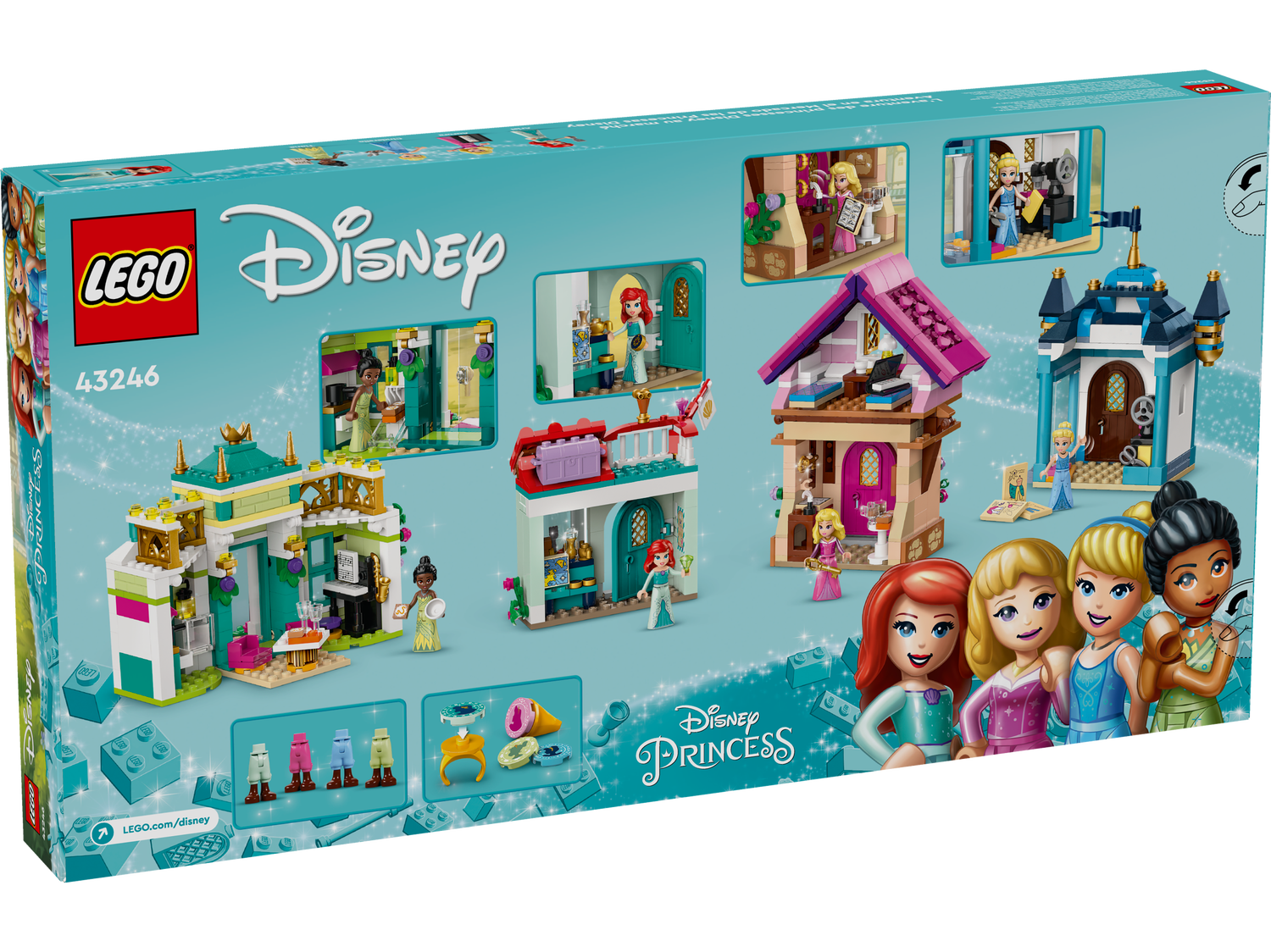 LEGO® ǀ Disney Princess: Disney Prinzessinnen Abenteuermarkt (43246) ist ein Bau- und Spielset, das Disney Princess Fans und Kinder ab 6 Jahren begeistern und lange beschäftigen wird. Die Box beinhaltet 4 baubare Spielzeuggebäude. Über dem Restaurant befindet sich ein kleines Staufach, und es gibt auch ein kleines Modell mit Blumentopf, Bank und Springbrunnen. Auch die LEGO ǀ Disney Spielfiguren Tiana, Aurora, Cinderella und Arielle sowie 2 Ringe zum Sammeln mit 4 beliebig austauschbaren Verzierungen laden zum Spielen ein. Kinder können mit all den fantasievollen Elementen für Rollenspiele viele Geschichten auf dem Markt und eigene neue Abenteuer darstellen.Dieses Disney Bau- und Spielset ist ein tolles Geschenk, das Kinder selbstbewusst und kreativ spielen lässt. Kinder und Erwachsene werden von den Details in den verschiedenen Häusern begeistert sein. Die Farben passen jeweils zu den Gewändern der Figuren. Darüber hinaus bietet die LEGO Builder App ein ebenso einfaches wie intuitives Bauerlebnis. Kinder können 3D-Modellansichten vergrößern und drehen, Sets speichern und ihren Baufortschritt verfolgen.