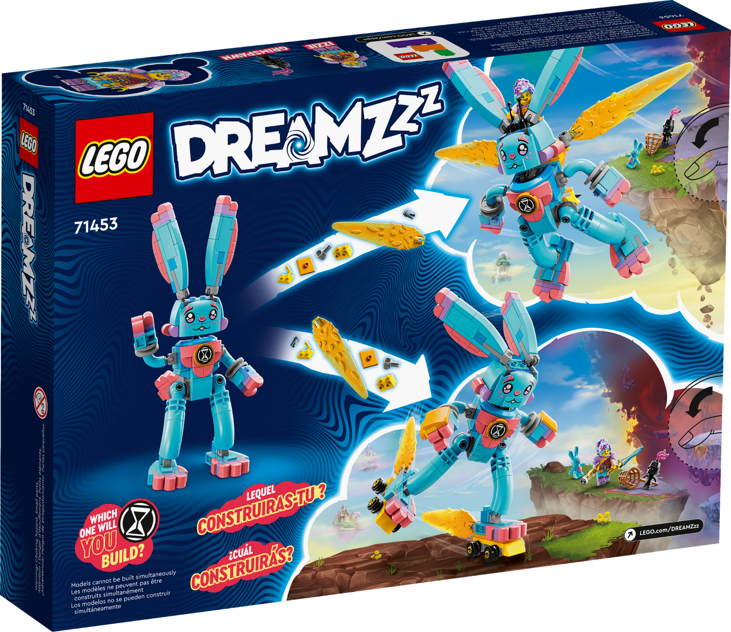 LEGO® DREAMZzz™ Izzie und ihre Hase Bunchu (71453) ist genau das richtige Bau- und Spielset, um Kinder ab 7 Jahren spannende Abenteuer in der Traumwelt erleben zu lassen. Das Set basiert auf der packenden Handlung der TV-Serie. Dein Kind kann der Hauptfigur Izzie helfen, eine große Version ihres liebsten Kuscheltiers zu erschaffen, um den Plüschhasen zu retten, der von einem Albgnom entführt wurde.1 Set, 2 BaumöglichkeitenDie lebendige große Version von Bunchu kann ihren Hals, ihre Arme und ihre Beine bewegen. Beim Bauen können Kinder die Bauanleitung in Form einer Bildergeschichte befolgen. Dein Kind kann selbst entscheiden, ob es die Figur lieber mit Rollschuhen und Handschuhen oder mit Bienenflügeln und einem Bienenstachel ausstattet.Fantastische MinifigurDie detailgetreue Minifigur Izzie lässt den Actionspaß zum Leben erwachen. Für Izzie sind im Set unter anderem eine Rüstung, ein Schwert und eine Sanduhr enthalten. Zwei weitere Figuren – ein Albgnom und ein kleiner Bunchu – lassen dein Kind die gesamte Geschichte nachstellen.