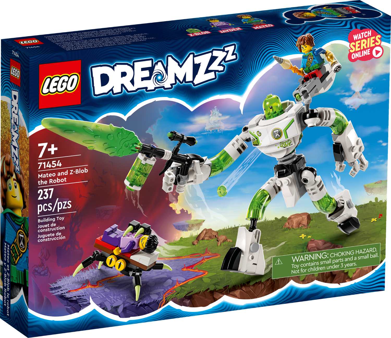 LEGO® DREAMZzz™ Mateo und Roboter Z-Blob (71454) schickt Kinder auf spannende Abenteuer in der Traumwelt. Das Bau- und Spielset basiert auf der packenden Handlung der TV-Serie DREAMZzz und lässt dein Kind Z-Blob in einen Roboter verwandeln, der Mateo hilft, den entführten Jayden aus den Fängen des Albtraummonsters zu befreien.1 Set, 2 BaumöglichkeitenDer große Roboter Z-Blob ist voll gelenkig und kann Oberkörper, Arme und Beine bewegen. Dein Kind kann Z-Blob mit Blastern an Händen und Schultern oder mit einem Raketenrucksack und einem Helm ausstatten. Das bietet fantasievollen Kinder doppelten Bau- und Spielspaß.Minifiguren erwecken das Actionspektakel zum LebenDas Set beinhaltet die detailgetreuen Minifiguren Mateo und Jayden. Für die beiden sind ein Gürtel, ein Bleistiftstab und eine Sanduhr enthalten. Dieses Zubehör ist für die Figuren aus der TV-Serie sehr wichtig.