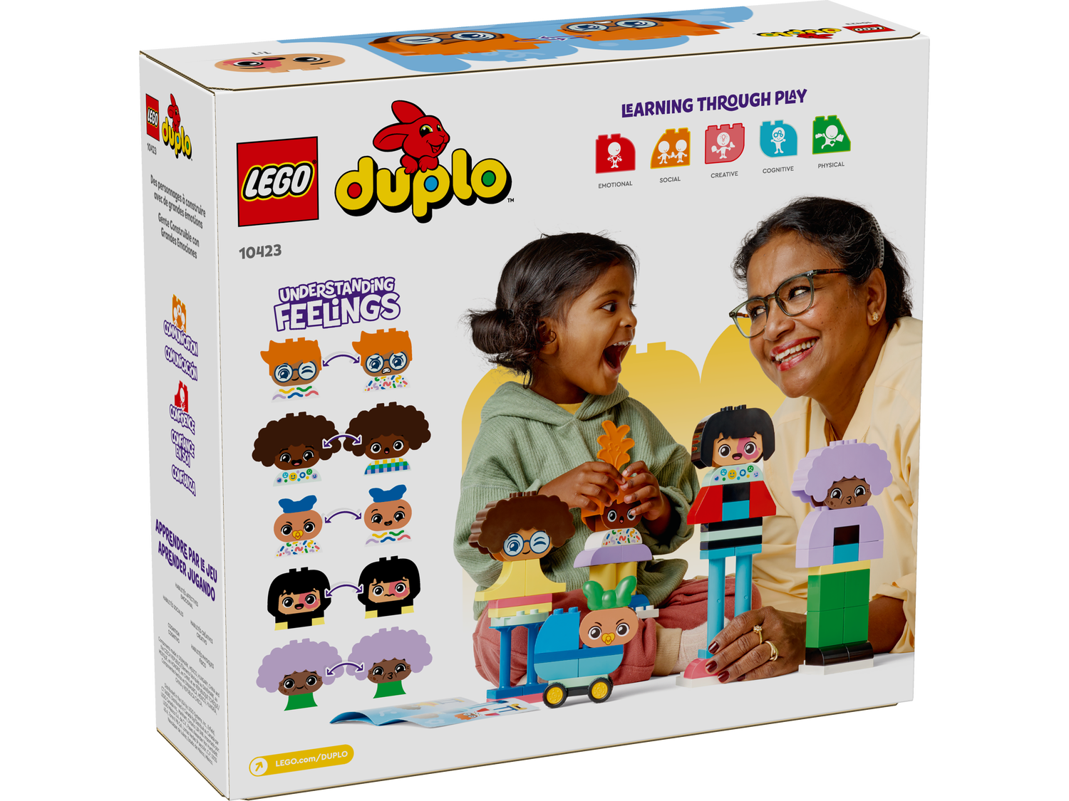 LEGO® DUPLO® Town Baubare Menschen mit großen Gefühlen (10423) bietet Kleinkindern ab 3 Jahren ein kreatives Spielerlebnis. Neugierige Kleinkinder erkennen, dass es ganz unterschiedliche Menschen gibt. Und dieses Spielzeug bringt ihnen bei, dass alle Freunde sein können, obwohl jeder anders aussieht.Dieses vielseitig umgestaltbare Spielzeug beinhaltet 71 Bausteine und Teile (darunter auch 5 Haarteile und 1 Fahrgestell), um 5 Figuren zu bauen. Kleinkinder lassen ihrer Fantasie freien Lauf, wenn sie die Körper, Beine, Gesichter und Haare zu unendlich vielen freundlichen Figuren kombinieren. Bausteine mit 10 verschiedenen Gesichtern lassen Kleinkinder ausdrücken, wie sich ihre Figuren fühlen. Außerdem können sie beschreiben, was diese Gesichter bedeuten. Das Set bietet Eltern außerdem die tolle Chance, mit Kleinkindern darüber zu sprechen, dass alle Menschen nicht nur ganz verschieden, sondern auch ganz besonders sind!Dieses Bauspielzeug beinhaltet bunte Bausteine in faszinierenden Formen, die kleine Finger gern näher erkunden werden. Auf jeden Fall lässt dieses Spielzeug Kleinkinder unendlich kreativ spielen.