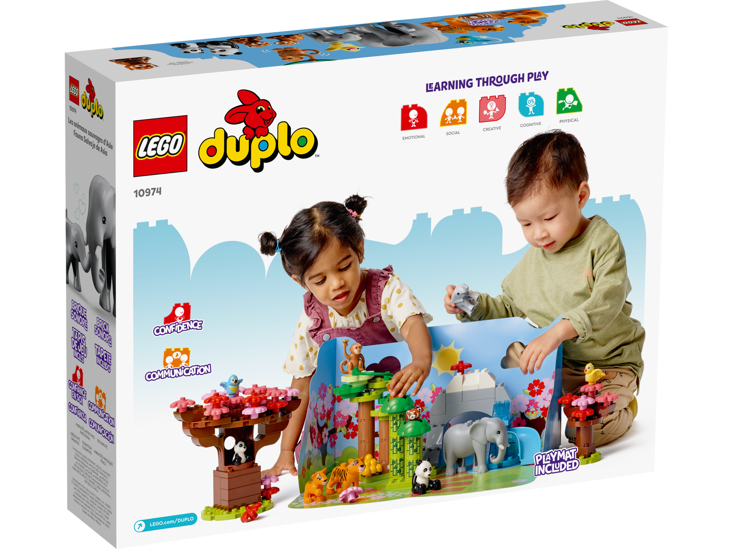 Jede Menge spannende Details und faszinierende Tiere in dem LEGO® DUPLO® Spielset „Wilde Tiere Asiens“ (10974) laden zum Spielen ein. Kinder ab 2 Jahren werden begeistert sein!Vorschulkinder können sehr viel entdecken – zusammen mit ihren ElternKinder, die sich für Tiere interessieren, werden von den unzähligen Spielmöglichkeiten in dieser asiatischen Wildniskulisse begeistert sein. Hier leben ein erwachsener Elefant, ein Baby-Elefant, Pandas und Tiger, ein Affe, 2 Vögel und 2 Rote Pandas. Neben einer faltbaren dreidimensionalen Dschungelspielmatte sind auch Bambus und ein blühender Kirschbaum enthalten. Und ein Sound-Stein lässt realistische Geräusche und Tierlaute ertönen.Spielerische Lernerfolge für KleinkinderAlle LEGO DUPLO Sets sind mit unterschiedlichen Figuren und vielen Details fachkundig zusammengestellt, damit dein Kind fesselnde Geschichten darstellen und erste GROSSE Entwicklungsschritte machen kann.