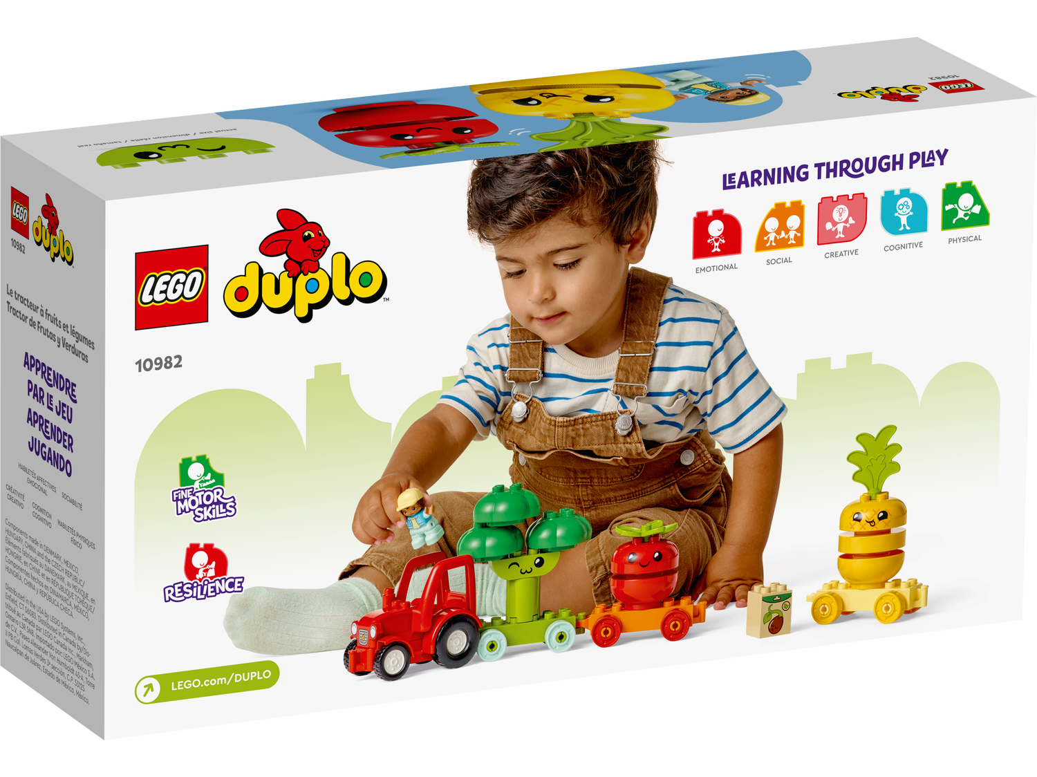 Der LEGO® DUPLO® Obst- und Gemüse-Traktor (10982) lässt Kleinkinder auf vielfältige Weise lernen. Vorschulkinder können den Landwirt auf seinem Traktor mit 3 Anhängern zur Obst- und Gemüseernte begleiten. Kinder ab 18 Monaten können mit dem Set das Stapeln üben, größere Fingerfertigkeit entwickeln und etwas darüber erfahren, wie Obst und Gemüse gedeihen. Indem sie die Bausteine stapeln, lassen sie die Pflanzen wachsen. Bunte Steine bieten jede Menge Sortierspaß. Vorschulkinder können jede Pflanze auf den farblich passenden Anhänger laden, die Farben kreativ mischen und neu kombinieren und sogar die Gesichter austauschen!Entwicklungsfördernde Spielzeuge für riesigen LernspaßAlle LEGO DUPLO Spielzeuge werden fachkundig konzipiert, um Kleinkinder mit bunten Bausteinen, faszinierenden Figuren und vielen Details fantasievoll spielen, interessante Geschichten darstellen und erste Fähigkeiten entwickeln zu lassen. Außerdem kann man dieses Spielzeug auch mit den anderen Biobauernhof-Spielsets sowie allen anderen LEGO DUPLO Modellen kombinieren.