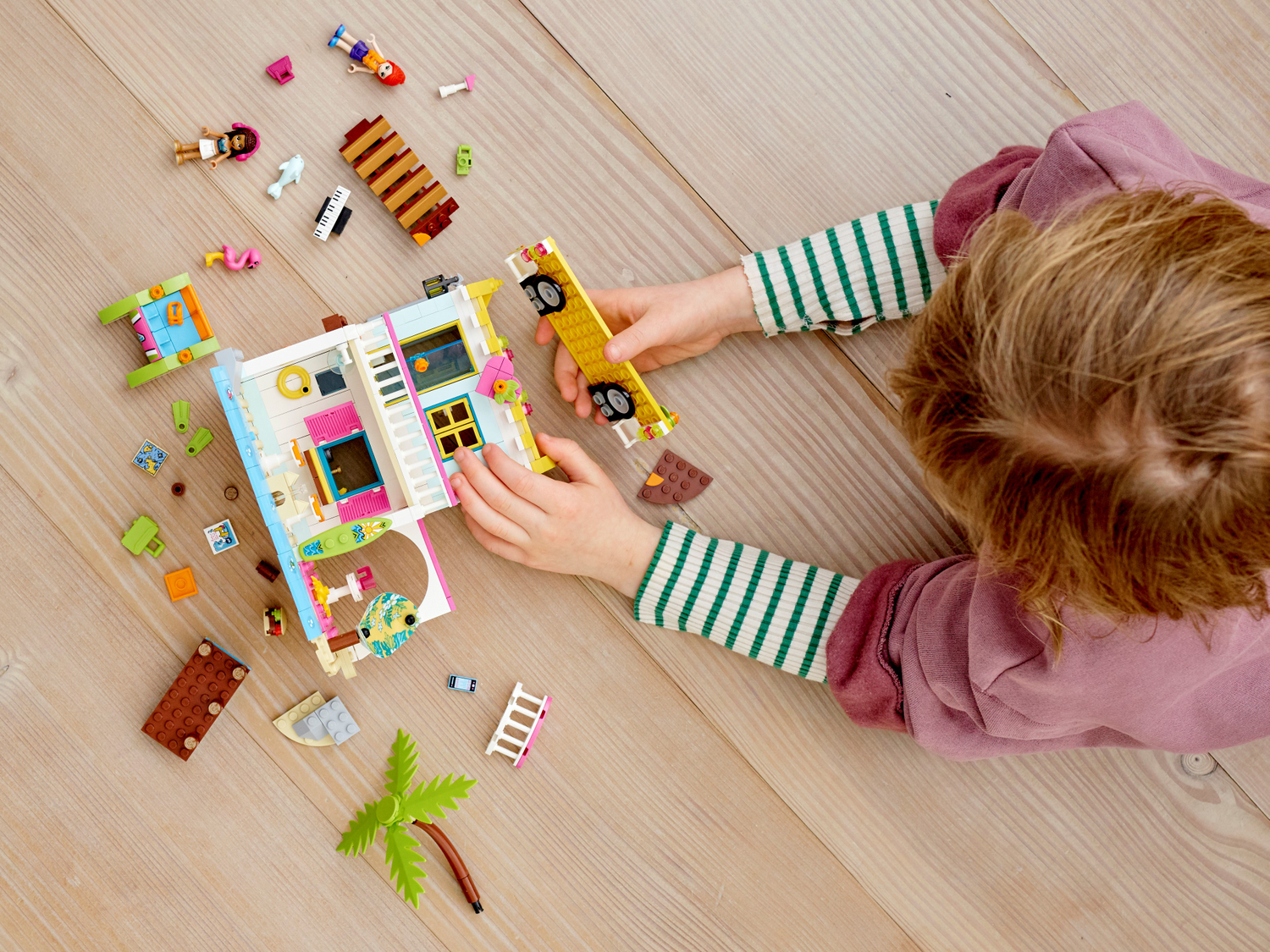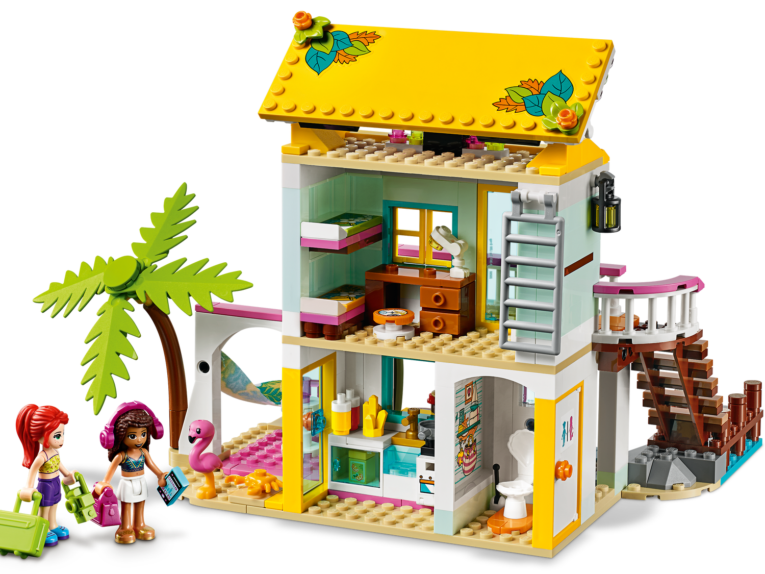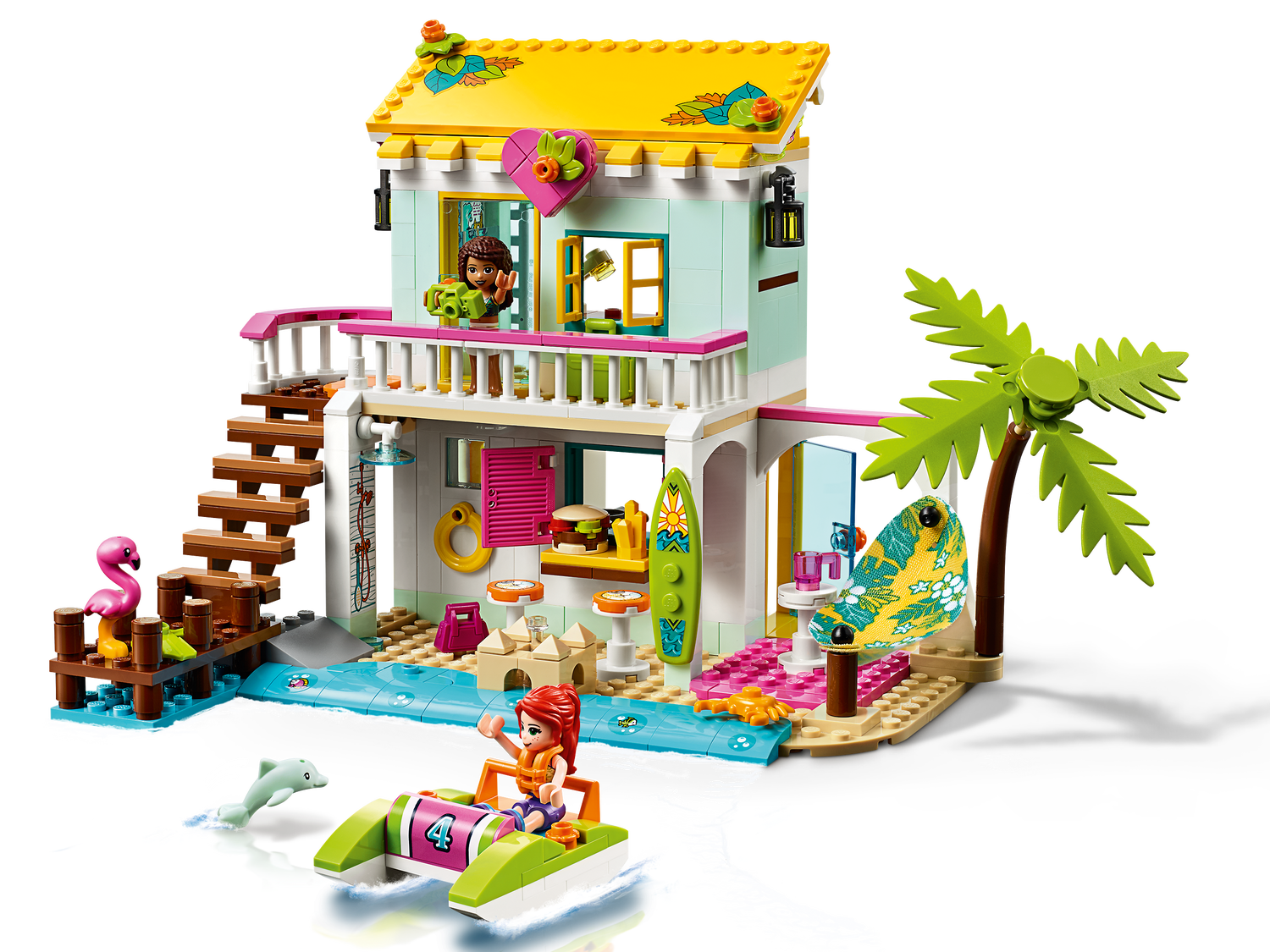 Mit dem LEGO® Friends Spielset „Strandhaus mit Tretboot“ (41428) können kleine Baumeister tolle Ferienabenteuer erleben. Das Strandhaus aus LEGO® Steinen enthält jede Menge Zubehör, um Kindern riesigen Ferienspaß zu bieten. Kinder können in der Küche einen Hamburger zubereiten, mit dem Tretboot hinausfahren, mit dem Surfbrett auf den Wellen reiten oder eine freche Krabbe daran hindern, die Kamera zu stibitzen.SonnenuntergangspartyDieses 444-teilige Set verspricht jede Menge Spielspaß. Es gibt auch eine Outdoor-Dusche und ein Badezimmer, wo sich die Mädchen für die Party stylen können. Das Dach lässt sich aufklappen, um ein Dachterrasse mit Lautsprechern, Lichtern und DJ-Pult zum Vorschein zu holen. Kinder können so tun, als würden mit Freunden eine coole Strandparty feiern und die ganze Nacht durchtanzen. Nach dem Partyvergnügen lockt das gemütliche Schlafzimmer mit Schreibtisch und zwei Kojen für die beiden Mädchen.Viel Spaß auf der LEGO® Friends PartyMit diesem Set lernen Kinder die LEGO® Friends Welt kennen. An der Seite von Olivia, Mia, Stephanie, Emma und Andrea entdecken sie ihre Interessen und gehen ihrer Leidenschaft nach. Sie finden bestimmt eine Freundin, die ihnen sehr ähnlich ist.