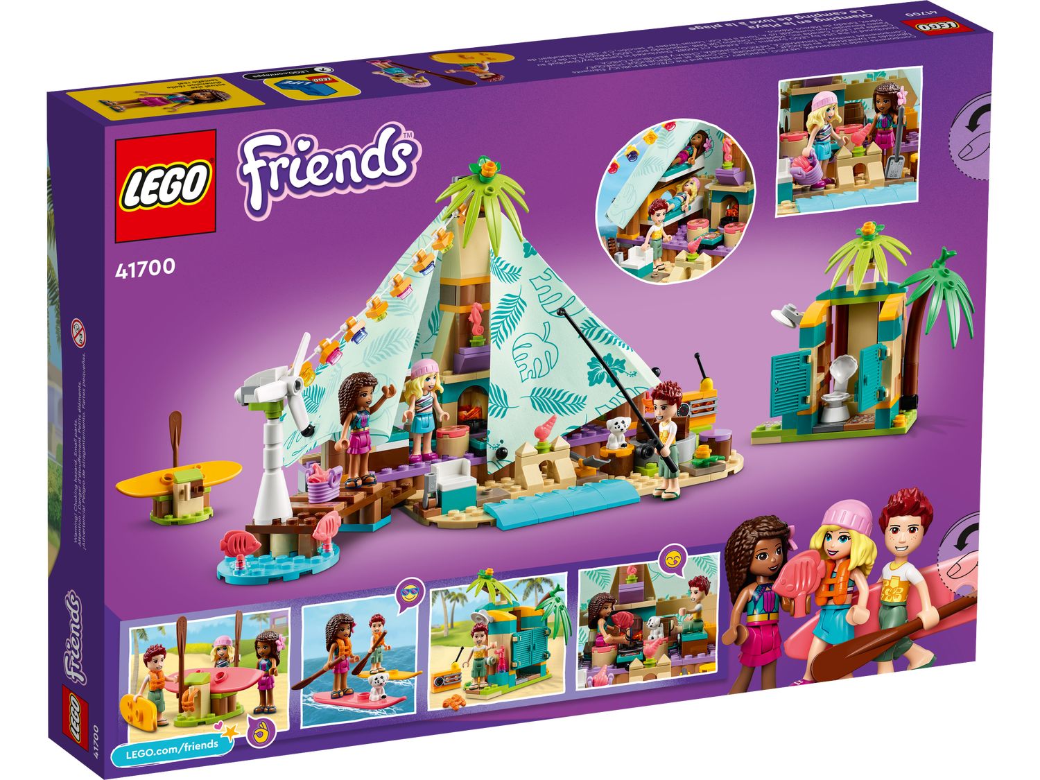 Das LEGO ® Friends Spielset „Glamping am Strand“ ist das perfekte Geschenk für Kinder ab 6 Jahren, die Ferien am Meer lieben. Kinder können ihren perfekten Tag am Meer darstellen: Sie spielen am Strand, rösten abends Marshmallows, schließen das Stoffzelt und träumen von einer gemütlichen Nacht im Zelt.Unfassbar viele SpielmöglichkeitenDieses Glamping-Spielset zum Sammeln beinhaltet 2 Paddleboards, auf denen die LEGO Friends zusammen mit ihrem Welpen Pebble die Küste erkunden können. An Land suchen sie dann Muscheln, bauen Sandburgen und benutzen das „Badezimmer“ unter freiem Himmel. Auf dem Steg können die Kinder angeln und ihren Fang dann auf dem Campingkocher im Zelt zubereiten, der von bequemen Sitzen und Stockbetten umringt ist.Noch größerer BauspaßDank einer digitalen Anleitung macht das Bauen noch mehr Spaß. Die in der kostenlosen LEGO Building Instructions App verfügbaren Funktionen zum Vergrößern und Drehen der digitalen Modellansicht zeigen den Jungen und Mädchen schon beim Bauen, wie ihr Sammlerstück aussehen wird. In Heartlake City wird dein Kind herausfinden, dass man die schönste Zeit im Kreise der Freunde verbringt.