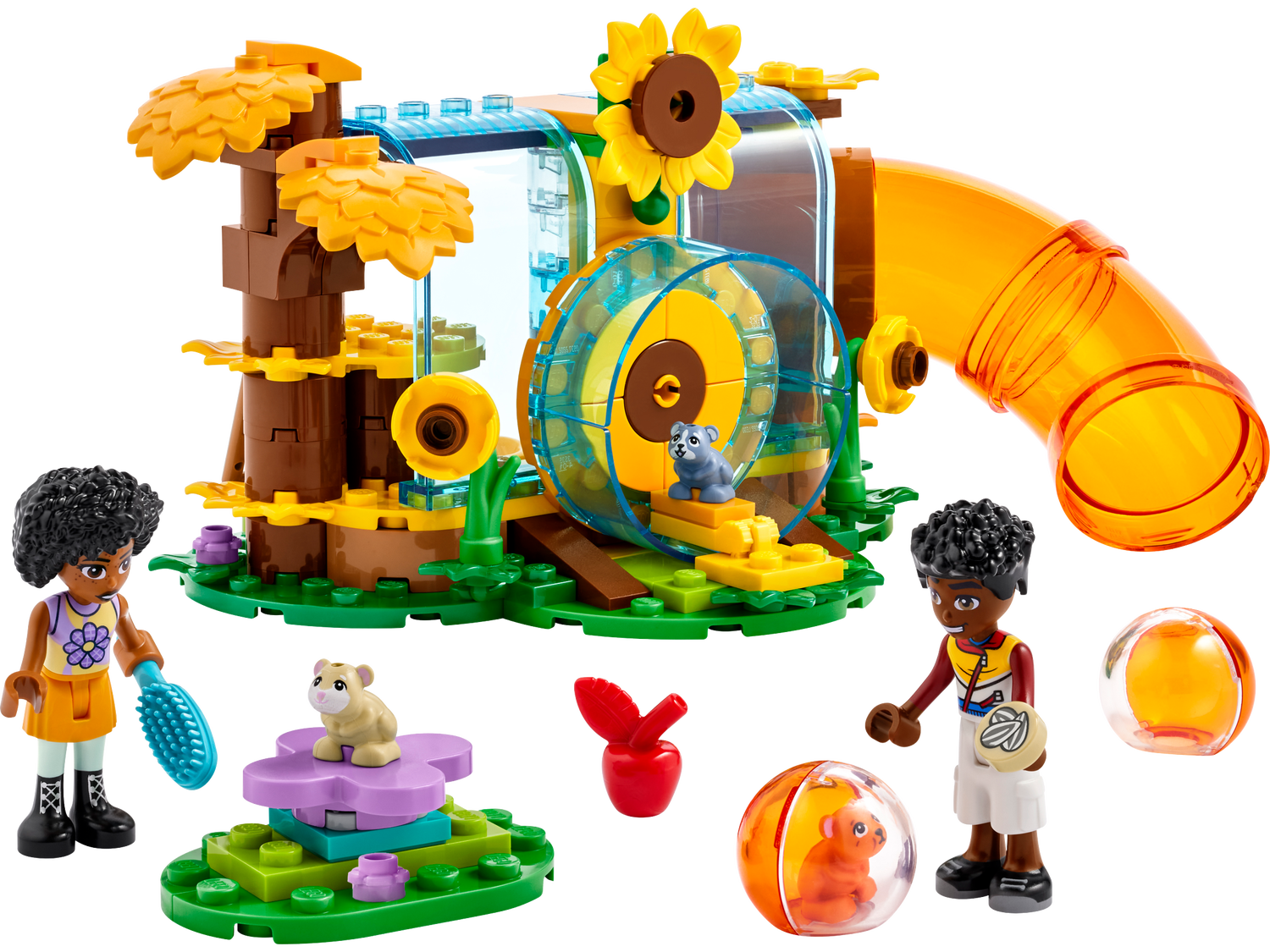 * Hamster-Spielset: Der LEGO® Friends Hamster-Spielplatz ist ein Spielset mit 2 Spielfiguren, 3 Hamstern und Tierpflegezubehör, das Mädchen und Jungen ab 6 Jahren viele Stunden begeistert spielen lässt* Bauset mit vielen Aktivitäten für die Hamster: Dein Kind kann sich um die Hamster kümmern und ihnen helfen, sich auf dem Karussell, auf der Rutsche, in den Laufbällen oder im Hamsterrad zu vergnügen* 2 Spielfiguren und 3 Hamster: Das Spielset beinhaltet die LEGO® Friends Spielfiguren Zac und Jamila sowie die Hamster Cheeky, Jellybean und Nibbler* Zubehör für Rollenspiele: Unter anderem lassen ein Apfel, Sonnenblumenkerne und eine Bürste dein Kind kreativ spielen* Geschenkidee für Kinder ab 6 Jahren: Dieses Bauset ist ein tolles Geburtstags- oder Weihnachtsgeschenk für Mädchen und Jungen, die Tiere und Bauspielzeug lieben* Spielzeug für kreative Rollenspiele: Schau dir auch die anderen separat erhältlichen LEGO® Friends Bausets an, die Kinder diverse Charaktere entdecken und viele Freundschaftsgeschichten und Alltagsabenteuer darstellen lassen* Abmessungen: Das Hauptmodell aus diesem 167-teiligen Set ist 9 cm hoch, 18 cm breit und 11 cm tief