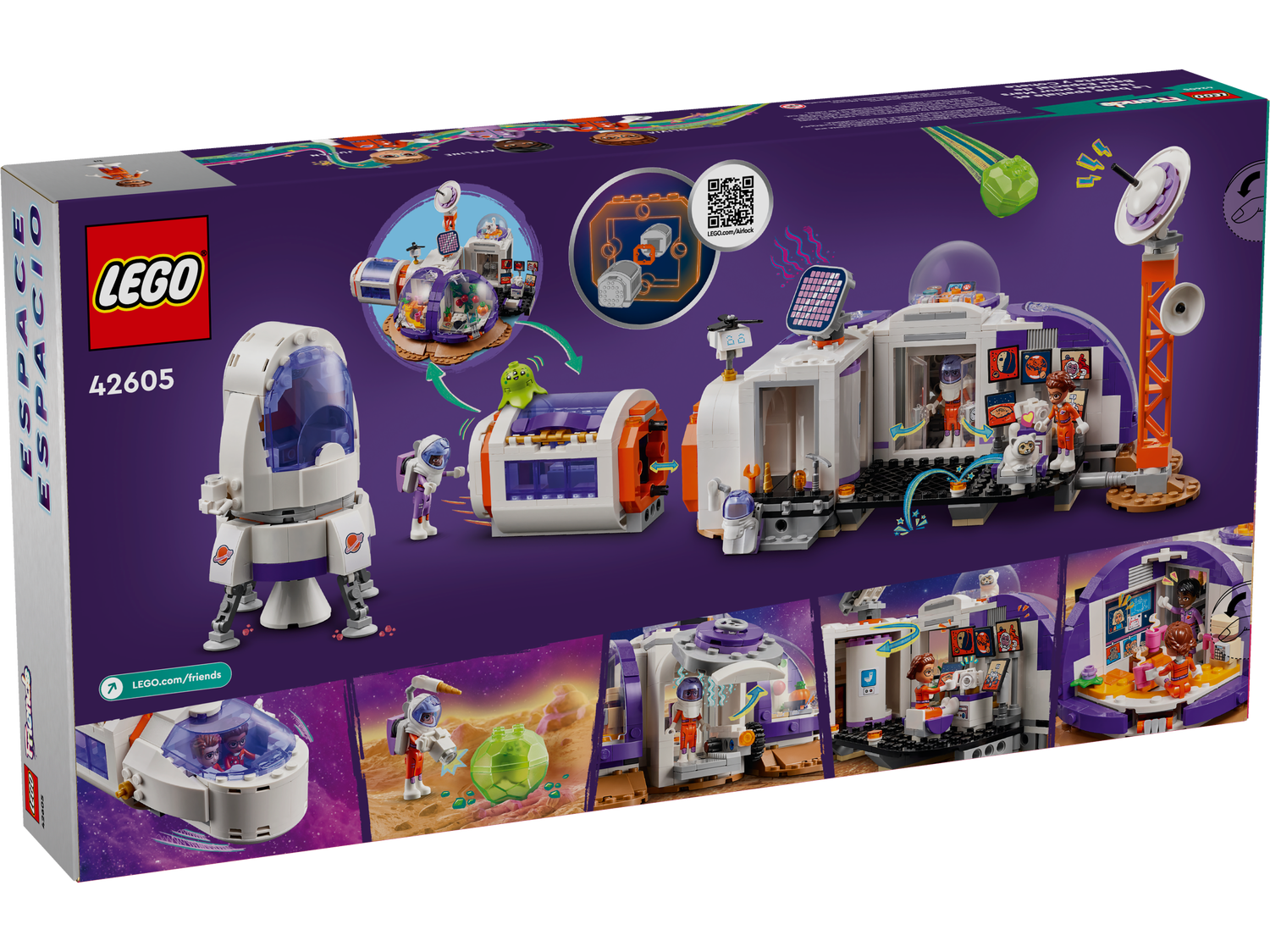 LEGO® Friends Mars-Raumbasis mit Rakete (42605) inspiriert junge Forscher dazu, sich näher mit dem Weltraum zu befassen. Das Bauset für Mädchen und Jungen ab 8 Jahren beinhaltet 3 Spielfiguren und eine Katze sowie eine Rakete, einen Erkundungsrover, eine Forschungsbasis aus Modulen und wissenschaftliches Zubehör.Dieses Bauset ist ein tolles Geburtstagsgeschenk für junge Weltraumreisende, die Wissenschaft und Technik lieben. Kinder können sich ausmalen, wie es wäre, auf dem Mars zu leben, während sie die Rakete bauen und die Figuren zur Forschungsbasis befördern. Dank des modularen Aufbaus kann man die verschiedenen Kapseln auch anders anordnen. In den Kapseln sind unter anderem Forschungs-, Kommunikations-, Gewächshaus- und Freizeitmodule untergebracht. Jede Menge Zubehör und Details wie ein Rover, eine Drohne und wissenschaftliche Instrumente laden zu vielen Rollenspielen ein.Zu dem Set gehört auch eine spezielle Luftschleuse, damit dein Kind das Modell für weitere Abenteuer auch an andere kompatible (separat erhältliche) LEGO Raumfahrt-Sets andocken kann.