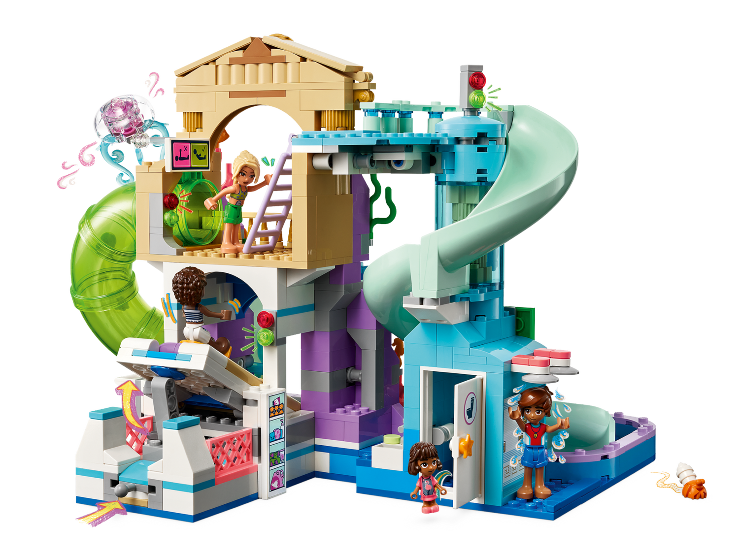 Der LEGO® Friends Heartlake City Wasserpark (42630) bietet Mädchen und Jungen ab 8 Jahren jede Menge Spielspaß mit den Freunden. 3 Spielfiguren und eine Mikro-Spielfigur sowie jede Menge Zubehör lassen Kinder kreativ spielen.Stell dar, welch einen Riesenspaß Leo, Alba, Aliya und Sara im Wasserpark haben. Setz die Figuren in den kreisenden Whirlpool oder lass sie die 3 tollen Rutschen hinuntersausen. Neben der Korkenzieherrutsche und der Röhre lockt auch noch eine Wasserfallrutsche mit einem Hebel, um Boote durch den Wasserfall zu schicken. Aber auch die Wasserkanonen, die Wassersteinchen verschießen, laden zum Spielen ein.Dieses LEGO Bauset für Kinder strotzt vor coolen Wasserparkdetails. Eine Dusche, eine Umkleide, Schließfächer und Snacks lassen Kinder viele Stunden kreativ spielen. Entdecke noch weitere Geburtstagsgeschenke für Kinder in der breiten Auswahl an separat erhältlichen LEGO Friends Sets. Zu diesem Spielzeug ist auch die LEGO Builder App verfügbar, die ein intuitivesBauerlebnis bietet.