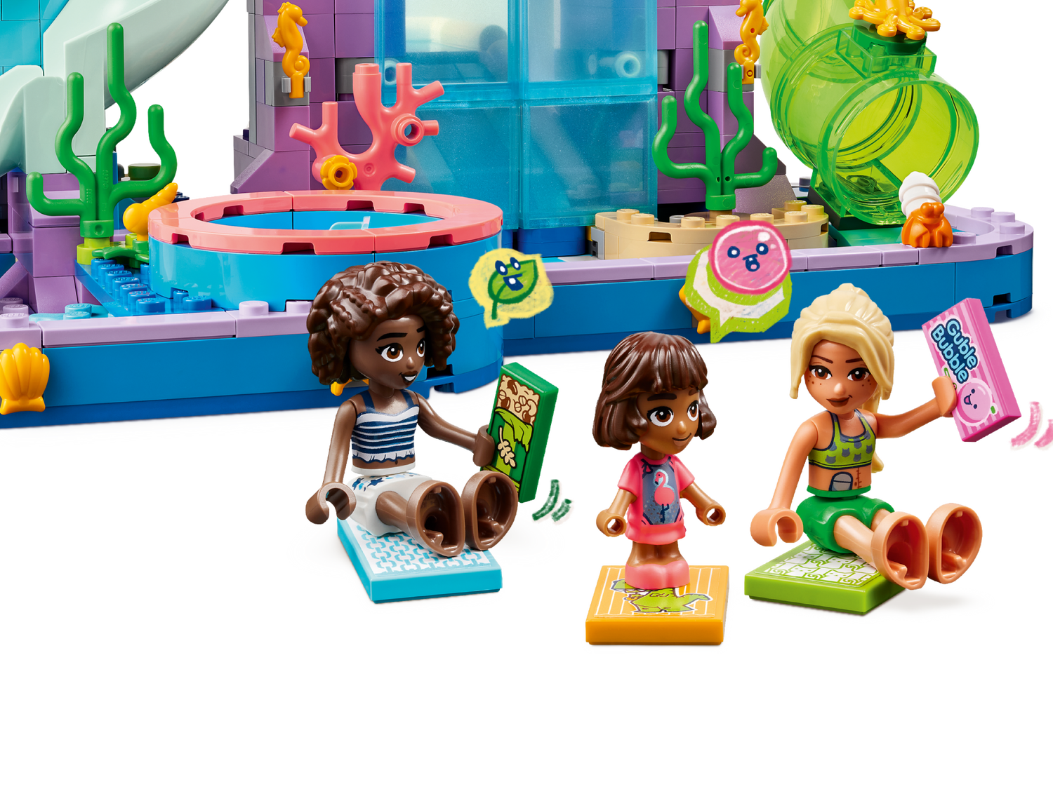 * Spielset mit Wasserpark für Mädchen und Jungen ab 8 Jahren: Dieses Bauset beinhaltet 3 Spielfiguren, eine Mikro-Spielfigur und einen baubaren Wasserpark mit 3 Rutschen und Whirlpool, damit Kinder kreativ spielen können* Kreisen, rutschen und spritzen: Junge LEGO® Baumeister erwarten viele lustige Rollenspiele. Sie können die Figuren im Whirlpool kreisen, die Rutschen hinuntersausen oder die Wasserkanonen ausprobieren lassen* 4 LEGO® Friends Figuren: Dieses Set beinhaltet die Spielfiguren Leo,Aliya und Sara sowie die Mikro-Spielfigur Alba, die Kinder zu verschiedenen Rollenspielen und Abenteuern im Wasserpark einladen* Jede Menge Wasserparkzubehör: Duschbereich, Umkleide, Schließfächer, Handtücher, Sonnencreme, Snacks und Deko-Meeresbewohner* Geburtstagsgeschenk für Kinder: Dieses Set ist eine tolle Geschenkidee für Kinder, die gern mit LEGO® Steinen bauen und Wasserparks lieben* Entdecke weitere Freundschaftsgeschichten: Schau dir auch die anderen separat erhältlichen LEGO Friends Bausets an, die Kinder diverse Charaktere entdecken und viele Alltagsabenteuer darstellen lassen* Abmessungen: Das Modell aus diesem 814-teiligen Set ist 21 cm hoch, 27 cm breit und 25 cm tief