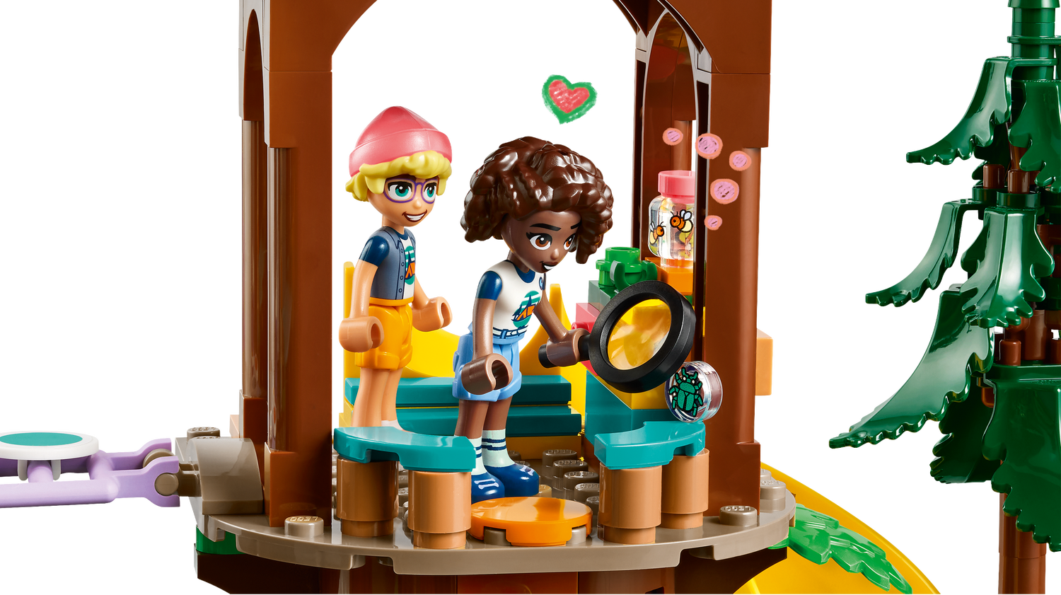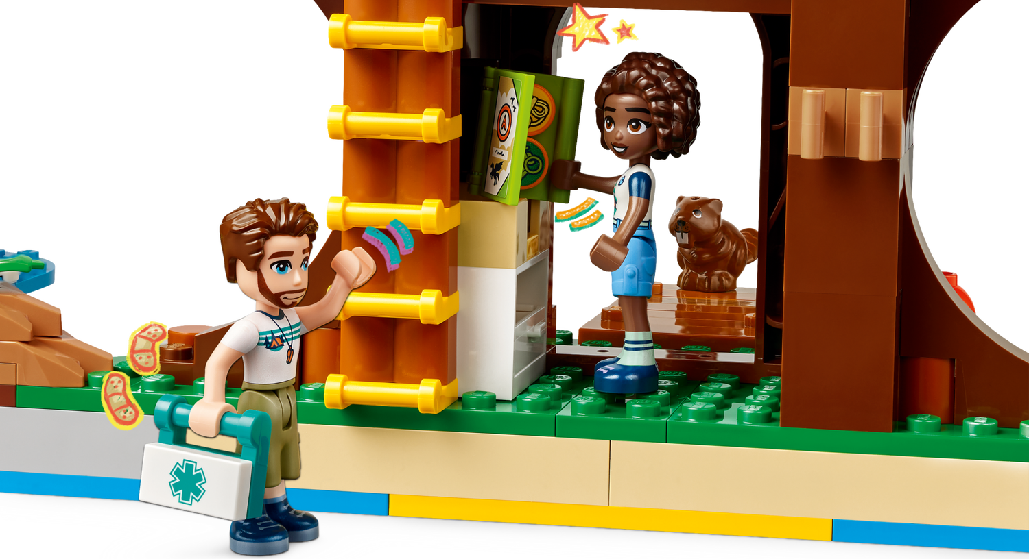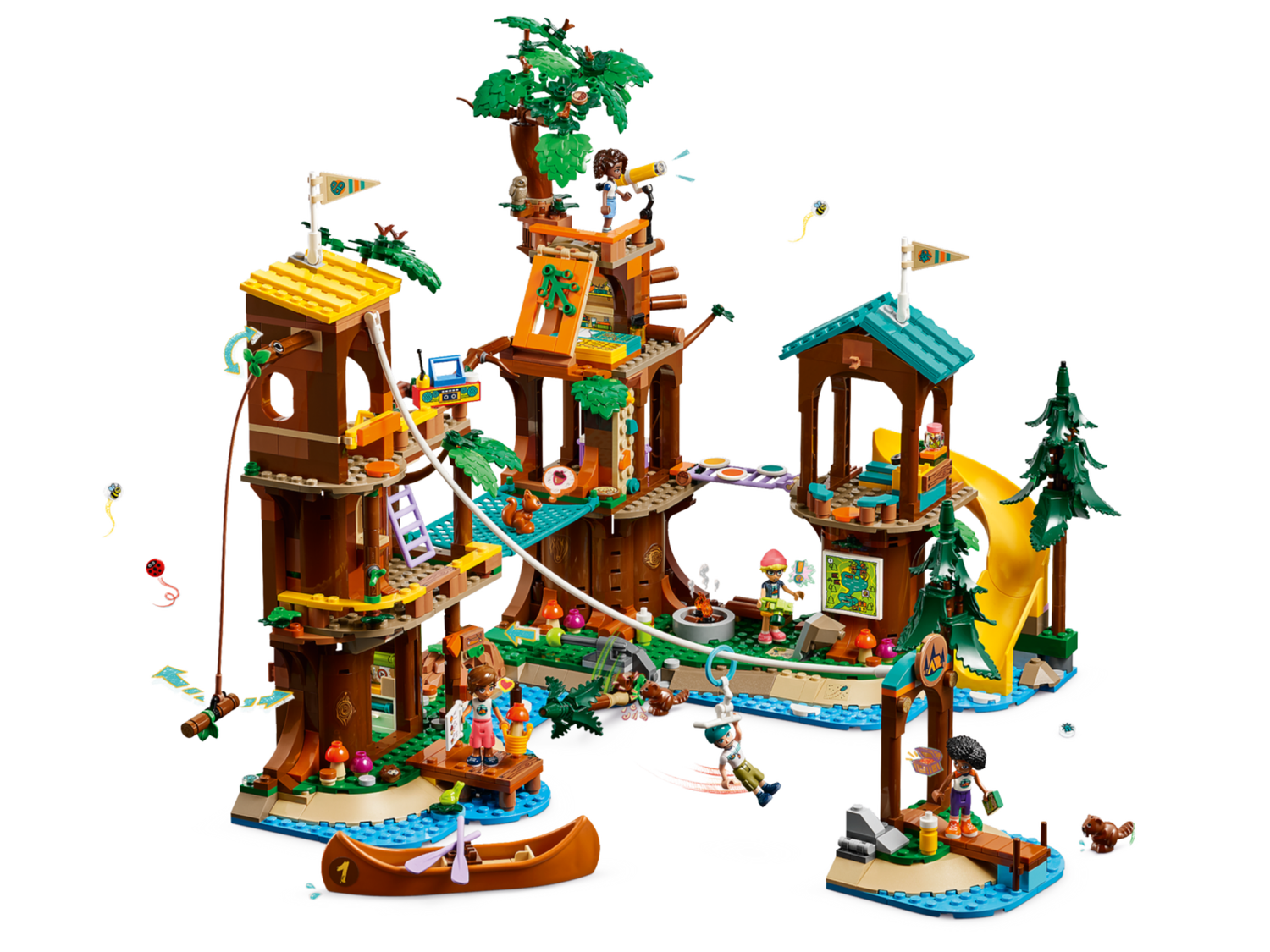 Das LEGO® Friends Baumhaus im Abenteuercamp (42631) ist ein Spielset, das Mädchen und Jungen ab 8 Jahren viele Campinggeschichten darstellen lässt. Kinder können die Freunde Leo, Aliya, Jamila und Olly unter Anleitung des Campbetreuers Jonathan aufregende neue Aktivitäten ausprobieren lassen.Viele coole Funktionen und Elemente lassen Kinder kreativ spielen. Das Bauset beinhaltet 5 Spielfiguren, Zubehör und einige Tiere, darunter auch 2 Biber, die einen Damm bauen. Lass die Figuren die Seilrutsche hinuntersausen oder hilf ihnen durch den Hindernisparcours mit Wackelbrücke, Kletterwand und Falltüren. Auch Aktivitäten wie das Kanufahren oder eine Insel, die per Boot oder Seilrutsche erreichbar ist, sind sehr verlockend!Dein junger Entdecker kann die Figuren auch Insekten suchen lassen. Werden sie alle Krabbeltiere entdecken und sich das Abzeichen verdienen? Halte nach dem putzigen Eichhörnchen Ausschau, das sich ein Versteck im Baumwipfel gebaut hat – mit Bett! Dieses Set ist eine tolle Geschenkidee für Mädchen und Jungen, die Spielzeugbaumhäuser lieben.