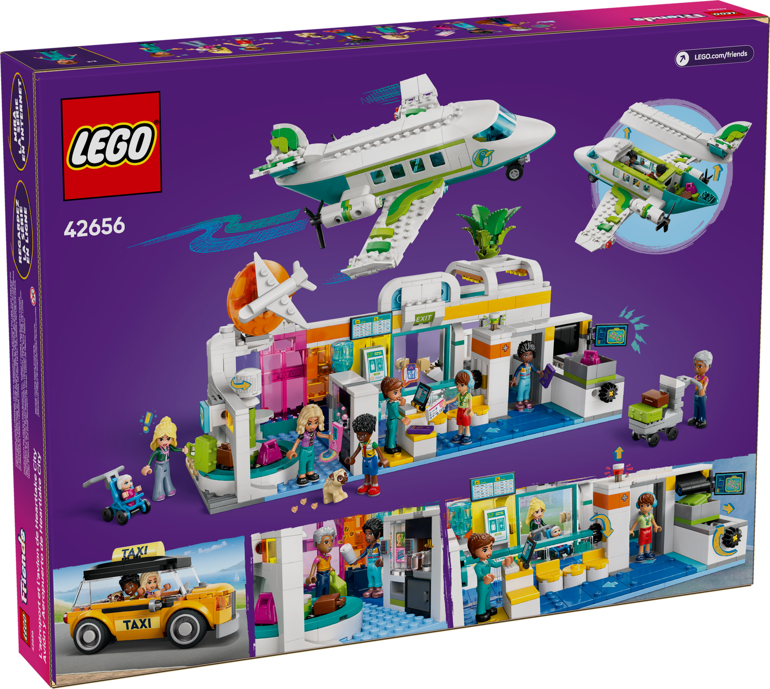 Der LEGO® Friends Heartlake City Flughafen mit Flugzeug (42656) ist ein Spielset, das Kinder ab 8 Jahren besonders fantasievolle Reiseabenteuer darstellen lässt. Baubare Modelle (Flughafen, Passagierflugzeug, Taxi und 2 Gepäckwagen) sowie 8 LEGO Friends Charaktere – darunter auch ein Baby – und ein Hund laden zum Spielen ein.Unzählige wirklichkeitsgetreue Details machen dieses Flughafen-Spielset zu einem tollen Geburtstags- oder Überraschungsgeschenk. Das Set beinhaltet auch ein Taxi, das Passagiere zum Flughafen bringt. Dort warten 2 Gepäckwagen, ein Check-In-Schalter und eine Sicherheitsschleuse mit grünen und roten Details. Auch ein Röntgengerät und ein drehbares Gepäckband dürfen nicht fehlen. Ein Verkaufsautomat, ein Wasserspender sowie Reisepass- und Ticket-Steinchen sind weitere faszinierende Details.Das baubare Flugzeug hat drehende Propeller, ein Pilotencockpit, 4 Passagiersitze und einen Frachtraum fürs Gepäck. Viele verschiedene Charaktere laden zu unterschiedlichsten Rollenspielen an dem betriebsamen Flughafen ein.