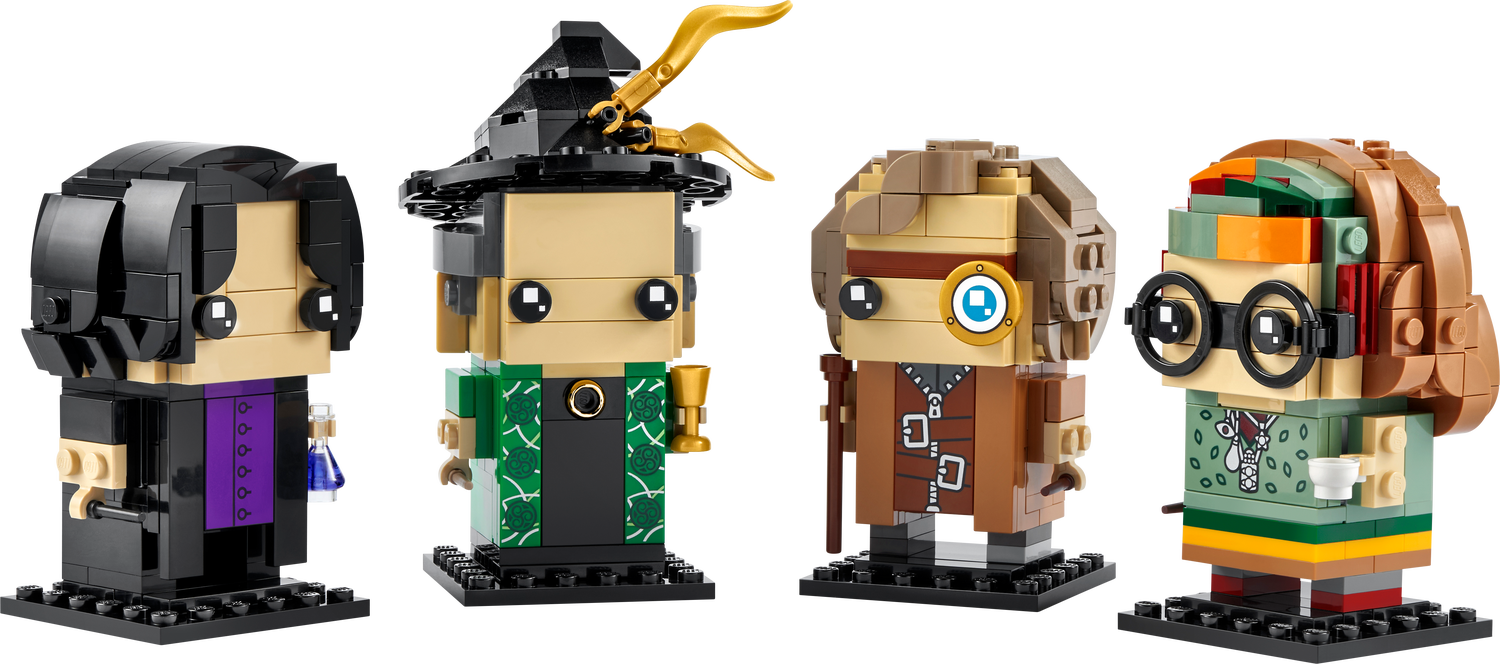 Zauberhafte Belohnung für Fans der Harry Potter™ Filme ab 10 Jahren. Das LEGO® BrickHeadz™ Set „Die Professoren von Hogwarts™“ (40560) stellt 4 berühmte Lehrer als coole BrickHeadz Sammelfiguren dar. Die detailgetreuen Figuren eignen sich zum Spielen und Ausstellen. Professor Snape™ ist mit einem schwarzen Umhang bekleidet. Professor McGonagall™ trägt dagegen ein grünes Kleid sowie einen Hexenhut mit goldenen Federn. Die Minifigur Professor Moody hat ein magisches Auge, und den Kopf von Professor Trelawney ziert ein buntes Stirnband.