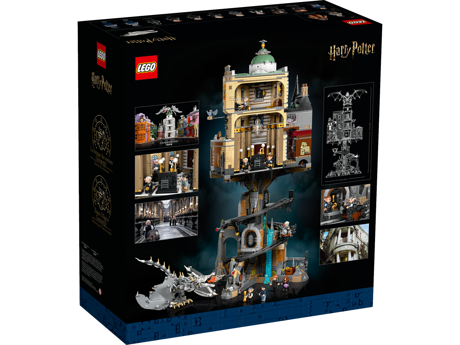 * LEGO® Harry Potter™ Gringotts™ Zaubererbank – Sammleredition (76417): Ruf dir Harry Potter Szenen in Gringotts™ Zaubererbank in Erinnerung, während du die stapelbaren Modelle der Bank, der 3 Verliese und des Ukrainischen Eisenbauchs baust* 13 LEGO® Minifiguren: 2 Versionen von Harry Potter™, Ron Weasley™, Bellatrix Lestrange/Hermine Granger™, Rubeus Hagrid™, ein Todesser, Bogrod, Griphook, Ricbert, 2 Kobolde und 2 Wachleute* Authentische Funktionen: Unter anderem ein Karren, der das spiralförmige Gleis hinunterfährt und an jedem Verlies hält sowie Bellatrix‘ Verlies mit versteckter Überraschung. Und auf den Rücken des Drachen passen 3 Minifiguren* Es gibt viel zu erkunden: Bilde das detailreiche Foyer und das Zwischengeschoss der Bank sowie die Magische Menagerie nebenan nach* Geschenkidee: Dieses 4.803-teilige Bauset ist ein tolles Geburtstags-, Weihnachts- oder Überraschungsgeschenk für erwachsene Harry Potter™ Fans und Sammler und eine schöne Belohnung für dich selbst* Modelle zum Bauen und Ausstellen: Das Modul mit Gringotts™ Zaubererbank ist 36 cm hoch, 32 cm breit und 25 cm tief. Aufeinander gestapelt sind die 3 Modelle 79 cm hoch* Kreatives Bauprojekt für eine oder mehrere Personen: In der Box und in der LEGO® Builder App findest du Schritt-für-Schritt-Bauanleitungen* Kombinierbar mit anderen separat erhältlichen LEGO® Harry Potter™ Sets: Das Modell von Gringotts™ Zaubererbank kann man an die separat erhältliche Winkelgasse (75978) anbauen* Qualitätsgarantie: LEGO® Elemente erfüllen die strengen Qualitätsstandards der Branche, damit sie einheitlich und kompatibel sind und sich fest zusammenstecken lassen* Sicherheit hat Vorrang: LEGO® Elemente werden jedem erdenklichen Test unterzogen und gründlich analysiert, damit sie strengste globale Sicherheitsstandards erfüllen