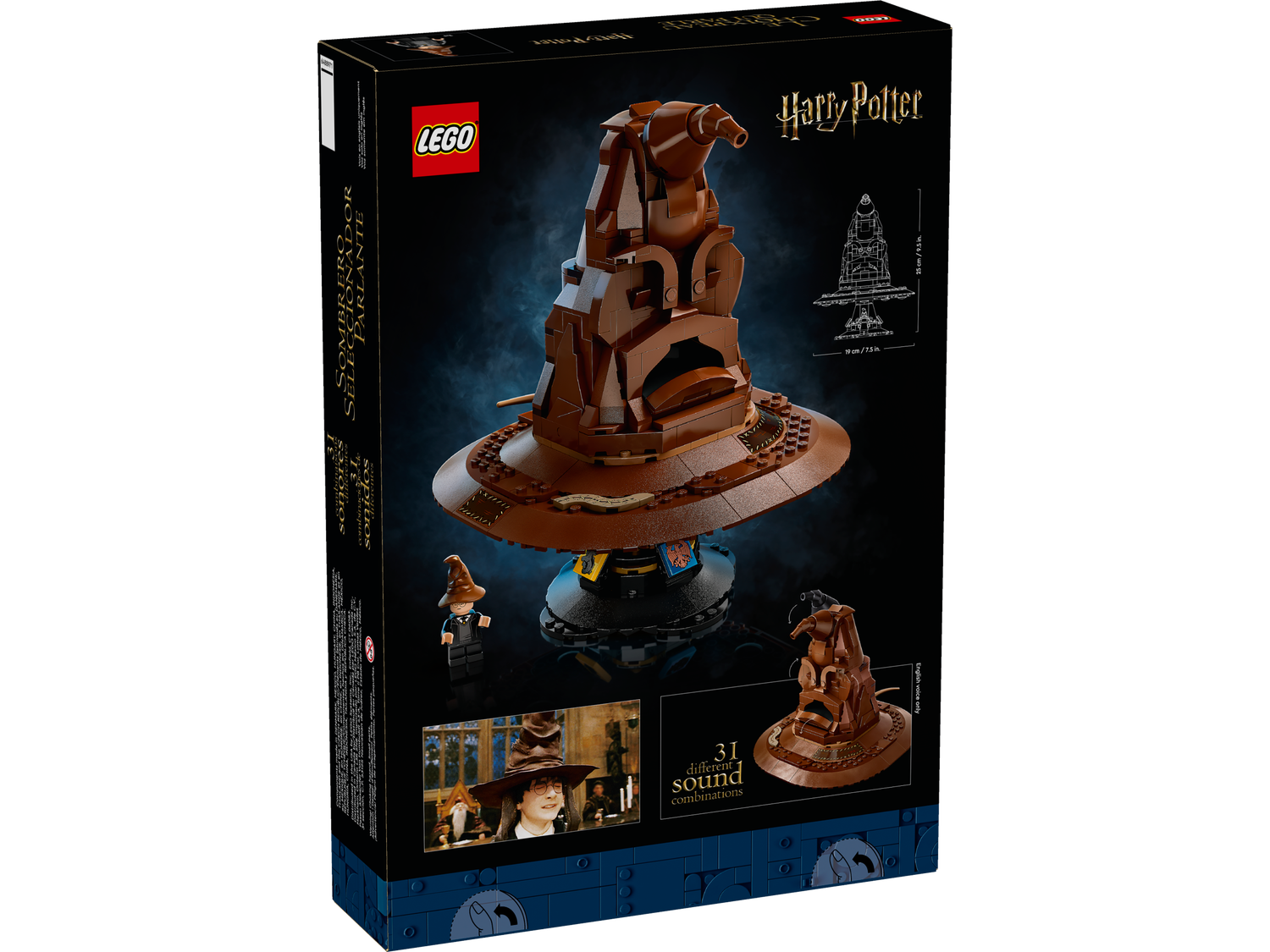 Der Sprechende Hut (76429) von Schloss Hogwarts™ ist das allererste LEGO® Harry Potter™ Set mit einem Geräuschstein, der dieses Modell zum Ausstellen zum Leben erweckt. Tippe oben auf den Hut oder setz ihn dir auf, um die Stimme des Sprechenden Huts zu aktivieren. Dann erfährst du, welches Hogwarts Haus er für dich auswählt. Ab und zu ist sogar das Lied des Sprechenden Huts zu hören.Stell den Hut auf den Ständer, der mit den Wappen der Häuser Gryffindor™, Slytherin™, Hufflepuff™ und Ravenclaw™ verziert ist. Die Minifigur Harry Potter mit Sprechendem Hut auf dem Kopf macht dieses einzigartige LEGO Set zu einem ganz besonderen Ausstellungsstück.Dieses Set zur spannenden Fantasy-Filmreihe ist eine magische Belohnung für dich selbst, ein tolles Präsent für Mütter und Väter, die die Zauberwelt lieben, und das beste Geschenk für andere erwachsene Fans der Harry Potter Filme.