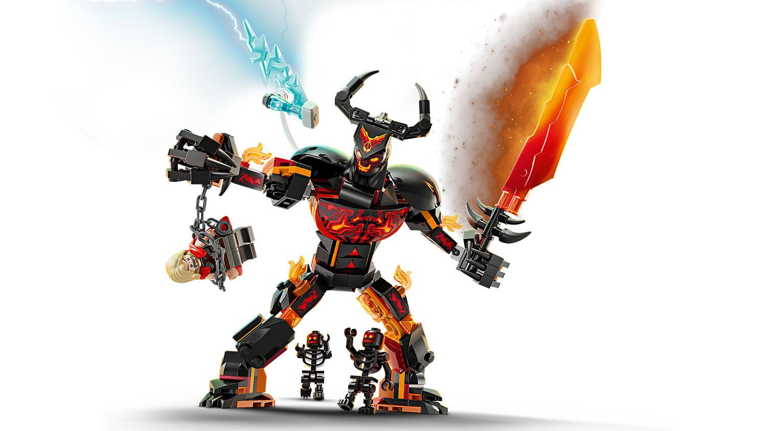 * Avengers: Thor vs. Surtur – Bauspielzeug für Kinder: In diesem LEGO® Marvel Spielset für Jungen und Mädchen ab 8 Jahren nimmt es die Superhelden-Minifigur mit einer Riesenbaufigur mit Flammenschwert auf* Marvel Charaktere zum Bauen und Spielen: Das Set beinhaltet 3 Minifiguren – Thor und 2 Feuerdämonen – sowie die große gelenkige Surtur Baufigur, die ein Flammenschwert schwingt und eine Hörnerkrone trägt* Avengers Spielset mit Superhelden: Kinder können eine Actionszene aus Thor: Ragnarok ausden Marvel Studios nachstellen und sich eigene fantasievolle Abenteuer ausdenken* Vielseitiges LEGO® Marvel Modell: Beinhaltet ein durchsichtiges Verbindungsstück, das unzählige fantasievolle Spielmöglichkeiten bietet und sich unter anderem an Thor befestigen lässt, um den Anschein zu erwecken, er würde fliegen* Avengers Geschenk für Kinder mit der Minifigur Thor: Überrasche Fans, die Marvel, die Avengers und Actionbauspielzeug lieben, mit diesem faszinierenden Superhelden-Geschenk* 3D-Bauanleitung: Für ein fesselndes Bauerlebnis können sich Kinder die LEGO® Builder App herunterladen. Mit den digitalen Funktionen kann man 3D-Modellansichten drehen und vergrößern, Sets speichern und den Baufortschritt verfolgen* Weitere LEGO® Marvel Spielsets: Das breite Spektrum an LEGO Marvel Bauspielzeugen eröffnet ein ganzes Spieluniversum, das sich ständig wandelt und Kinder zu unzähligen fantasievollen Superhelden-Abenteuern einlädt* Große baubare Actionfigur: Dieses vielseitige Spielset aus 245 Teilen lässt Kinder viele Superhelden-Abenteuer mit der 18 cm großen Surtur Baufigur darstellen