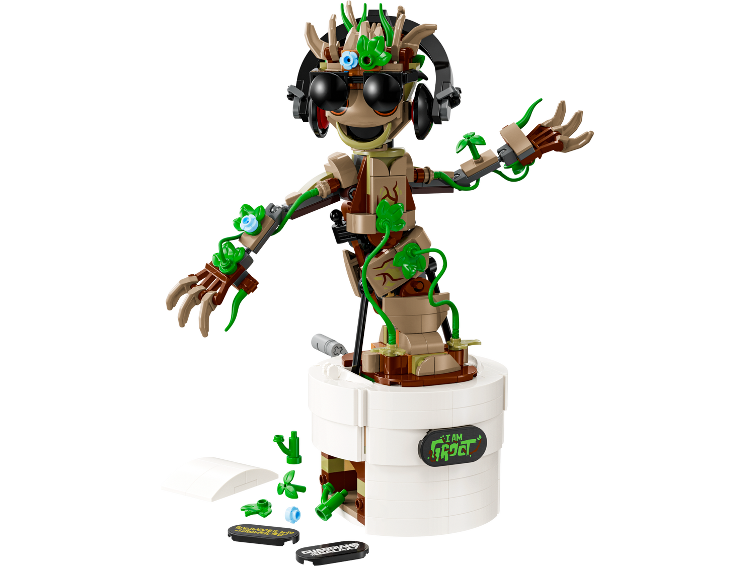 LEGO® Marvel Tanzender Groot (76297) ist ein Guardians of the Galaxy Bauspielzeug mit interaktiver Tanzfunktion. Das Set ist ein tolles Geschenk für Kinder ab 10 Jahren, die den Marvel Charakter Groot, Superhelden und LEGO Bauspielzeuge lieben.Dieser Groot zum Bauen und Spielen kann seinen Kopf und seine Arme bewegen. Wenn Kinder den Griff auf der Rückseite des Blumentopfes drehen, beginnt der gelenkige Groot zu tanzen. Man kann die Figur zusätzlich mit Blättern, einem baubaren Kopfhörer und einer Sonnenbrille aufpeppen. Kinder können dem Blumentopf ihre ganz persönliche Note verleihen, indem sie 1 von 3 Namensschildern vorne am Topf befestigen. Eines davon bezieht sich auf die TV-Serie Ich bin Groot. All diese Zubehörelemente lassen sich in einem Fach im Blumentopf verstauen. Mit der LEGO Builder App macht das Bauen sogar noch mehr Spaß, denn in der App können Kinder 3D-Ansichten des Modells vergrößern und drehen und ihren Baufortschritt verfolgen.