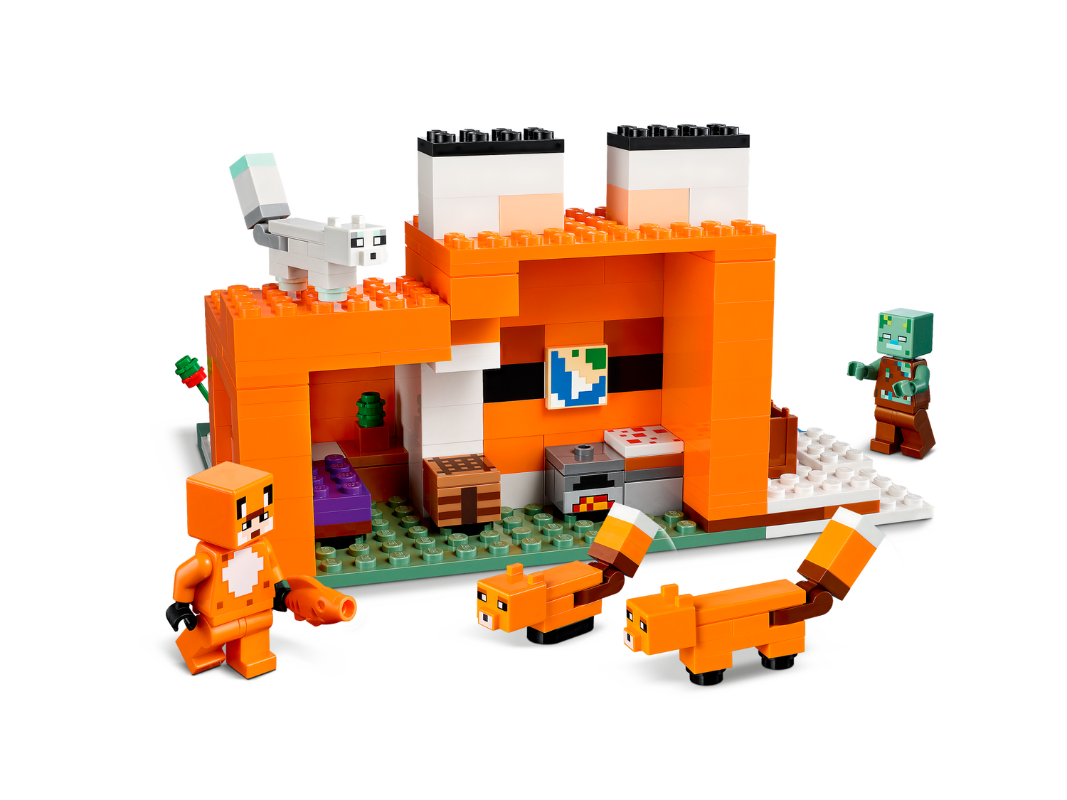 Verschiedene coole Charaktere, authentischen Zubehörelemente und unzählige Spielmöglichkeiten machen das LEGO® Minecraft® Set „Die Fuchs-Lodge“ zu einem perfekten Geschenk für Kinder ab 8 Jahren.An der Fuchs-Lodge ist immer viel losKinder benutzen ihre Minecraft Fähigkeiten, um ein Haus zu bauen, das wie ein schlafender Fuchs aussieht. Die offene Rückseite und das abnehmbare Dach des Bauwerks lassen Kinder die Möbel umstellen und fantasievolle Rollenspiele darstellen. Draußen kann man einen Baby-Fuchs, einen erwachsenen Fuchs und einen Polarfuchs mit Beeren füttern. Aber Vorsicht: Der Ertrunkene, ein beliebter Zombie-Charakter aus dem Videospiel, treibt hier sein Unwesen. Nachdem dein Kind den Zombie mit dem Schwert verscheucht hat, kann es sich etwas Leckeres angeln.