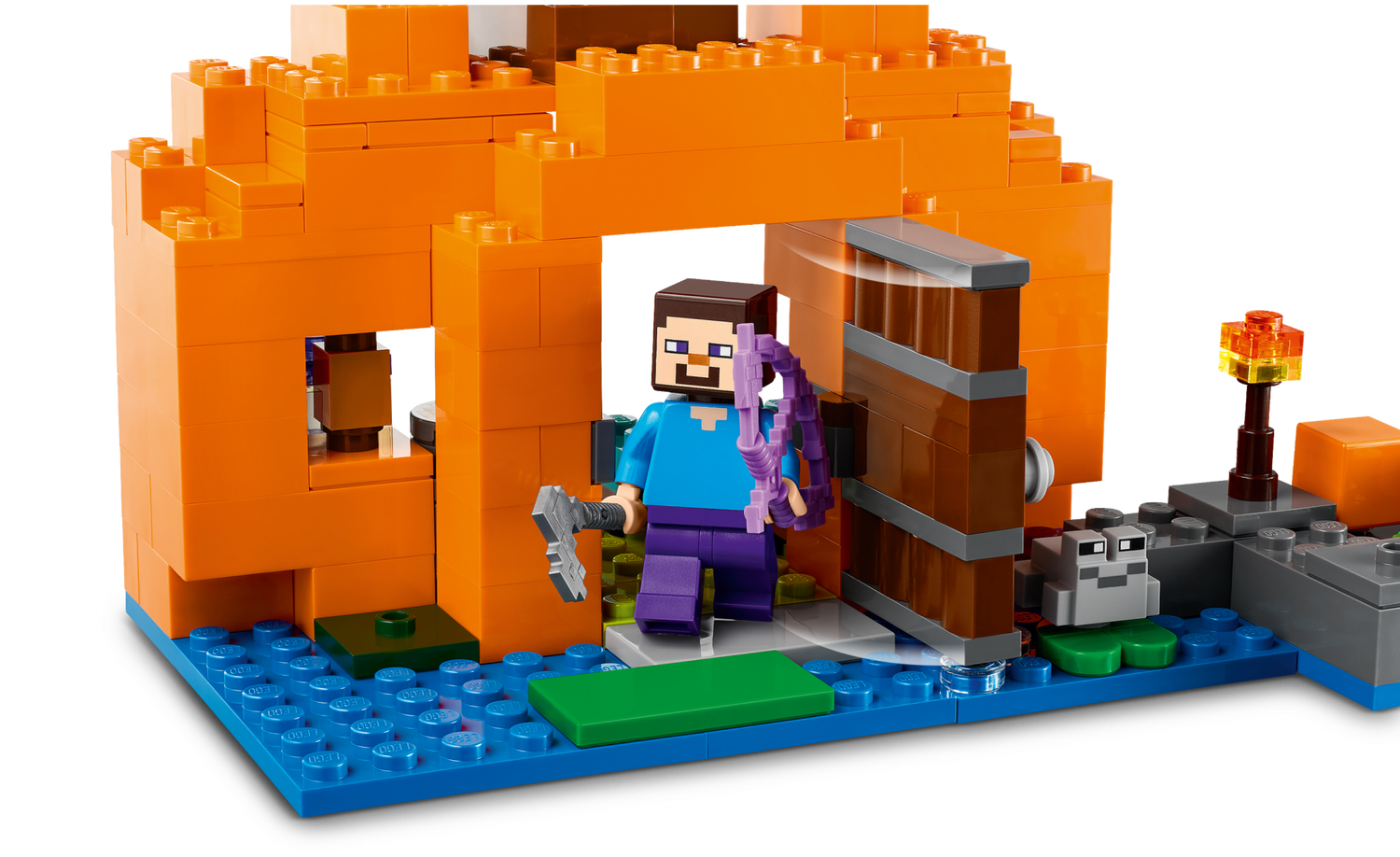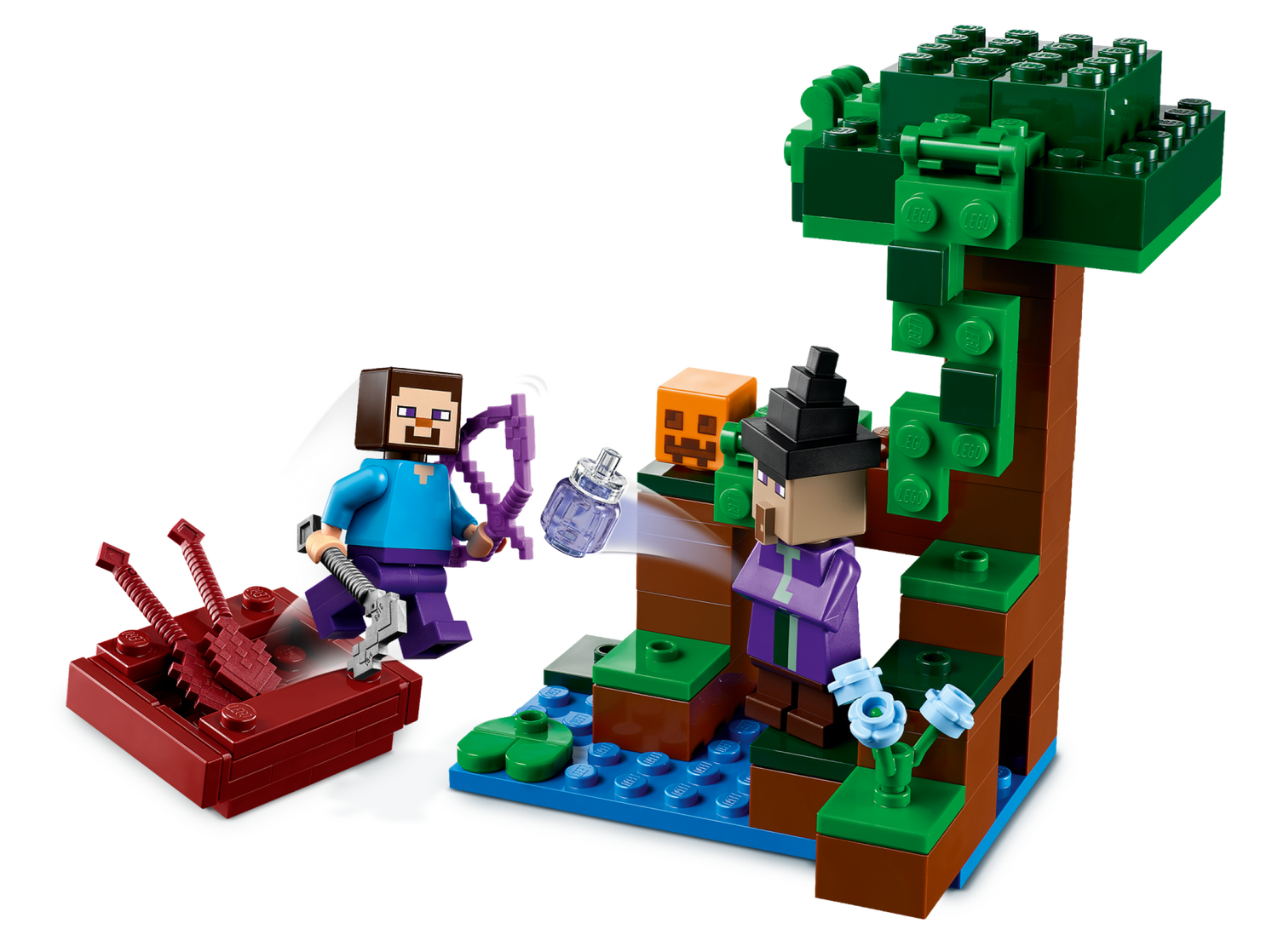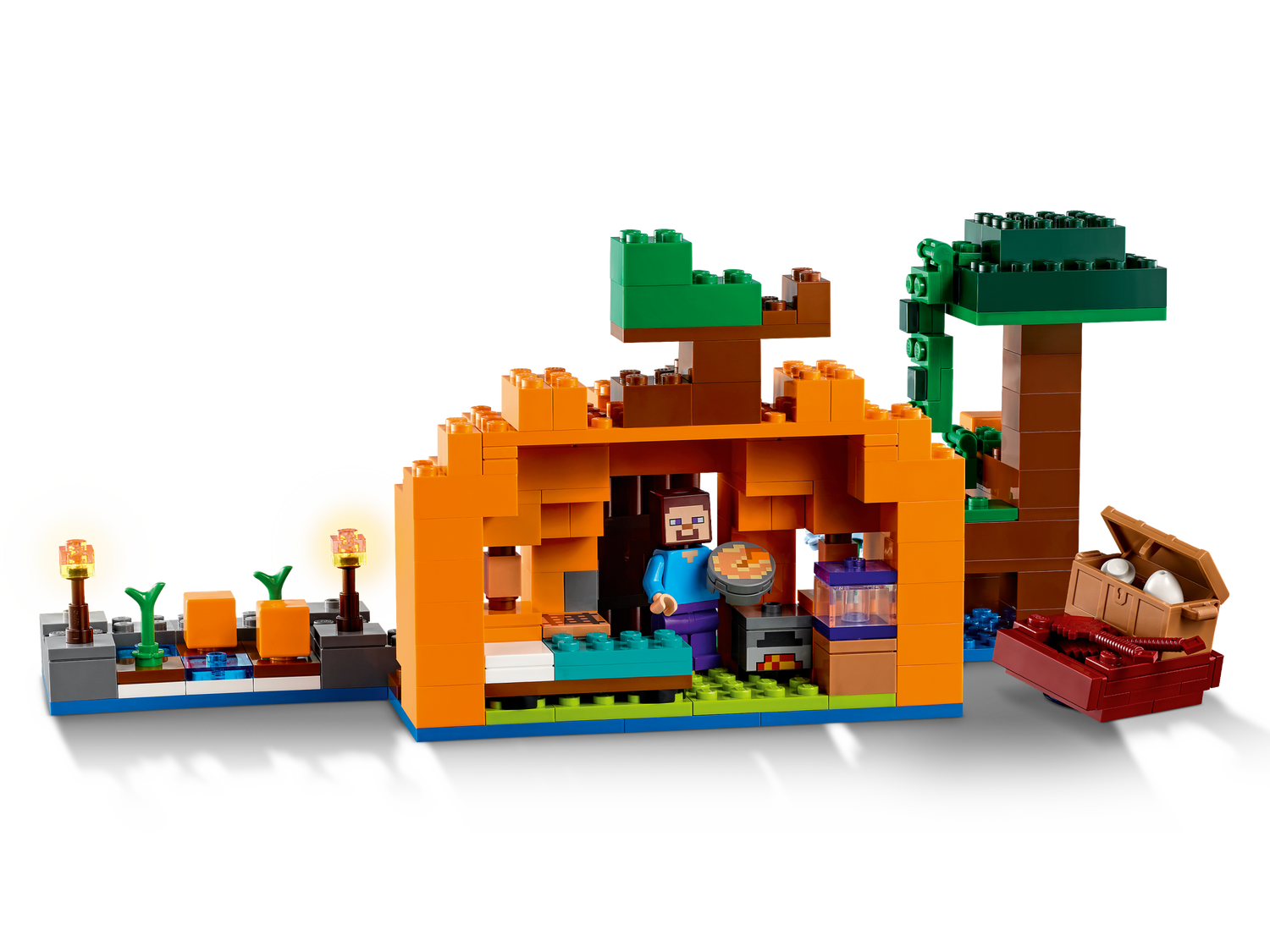 LEGO® Minecraft® Die Kürbisfarm (21248) ist genau das richtige Spielset für ein Spielerlebnis, in dem sich alles um Kürbisse dreht. Die Hauptrollen spielen eine der beliebtesten Figuren des Videospiels sowie eine lästige Hexe. Kinder ab 8 Jahren können mit diesem vielseitigen Action-Spielset viele spannende Abenteuer im Kürbisbeet darstellen.Minecraft Spielset für spannende Abenteuer im KürbisbeetDieses überaus wandlungsfähige Haus steht im berüchtigten Sumpf-Biom des Videospiels. Das Setbeinhaltet die Hauptfigur Steve und eine Kürbisfarm einschließlich Farmhaus in der Form eines Kürbisses. Das Haus ist mit einem Bett, einer Werkbank, einem Schmelzofen und einer Froschlampe voll eingerichtet. Draußen befindet sich ein Kürbisbeet, das Steve mit seiner Hacke bearbeitet. Aus Ackerbau wird ganz schnell ein Actionabenteuer, als eine Hexe Zaubertränke auf Steve wirft, der sich schnell seinen Bogen schnappt, um sie zu verscheuchen. Das Set beinhaltet auch einen Frosch, ein Boot und eine Truhe mit einem Ei und Zucker. Für zusätzlichen digitalen Bauspaß können Baumeisterinnen und Baumeister mit der coolen LEGO Builder App 3D-Modellansichten vergrößern und drehen und ihren Baufortschritt verfolgen.