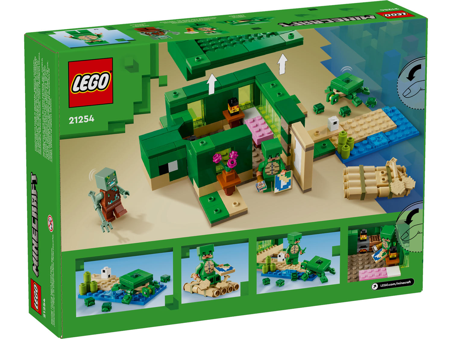 Das Modell dieses Hauses besitzt die Form einer Minecraft® Schildkröte. Drinnen und draußen laden die Tiere zu jeder Menge Spielspaß und Minecraft-Action ein. LEGO® Minecraft Das Schildkrötenstrandhaus (21254) beinhaltet 3 legendäre Charaktere sowie ein cooles Bauwerk zum Zusammenfügen. Dieses Set ist eine tolle Geschenkidee für Kinder und Minecraft-Spieler ab 8 Jahren.Dein Kind kann ein Minecraft-Haus in Form einer Schildkröte und mit Fenstern, Laternen, einer Tür, einem Bett, einem Tisch, einer Werkbank und einem Ofen bauen. Das abnehmbare Dach gewährt leichten Zugang zum Innenleben. Draußen befindet sich ein Strandabschnitt mit Zuckerrohr, Schildkröteneiern und einem Bambusfloß mit Paddeln. Vertraute Minecraft-Figuren und Kreaturen sind ebenfalls enthalten: ein Schildkrötenkrieger mit Schildkröten-Skin und Helm, ein Ertrunkener mit Dreizack, eine Schildkröte, die an Seetang knabbert, sowie 3 Babyschildkröten. Auch ein Fernglas und eine Karte sind in diesem Spielset enthalten. Kinder, die actionreiche Videospiele, kreative Modelle und Tiere lieben, werden von diesem vielseitigen Spielzeug begeistert sein. Für ein zusätzliches digitales Bauerlebnis enthält die LEGO Builder App Funktionen, um 3D-Ansichten der Modelle zu vergrößern und zu drehen und den Baufortschritt zu verfolgen.