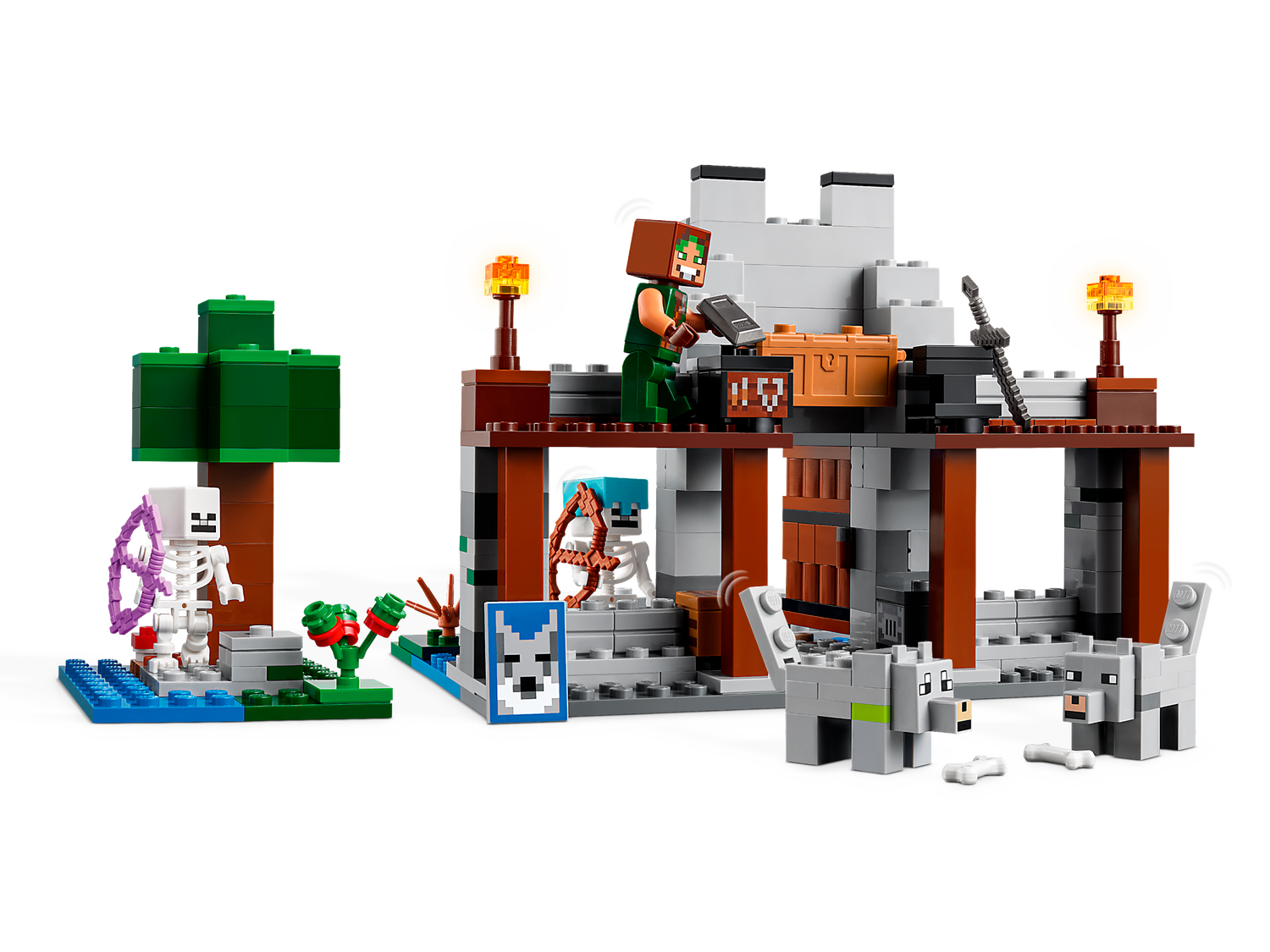 LEGO® Minecraft® Die Wolfsfestung (21261) ist genau das richtige Spielzeug für actionbegeisterte Kinder, die Abenteuer-Spielsets, Festungen und Minecraft-Charaktere lieben. Dieses Spielzeug zum Videospiel lässt Kinder ab 8 Jahren kreativ bauen undin der Rolle eines Helden und Entdeckers spannende Action erleben.Kinder bauen dem Wolfbändiger eine Festung mit großem Wolfskopf über dem Eingang, den sie freundlich oder zornig dreinblicken lassen können. Drinnen befinden sich eine Werkbank, ein Sch melzofen und ein Amboss – und zum ersten Mal in einem LEGO Minecraft Set auch ein Schmiedetisch. In einer Vorratskiste befindet sich ein Netheritbarren, aus dem Kinder ein Schwert, süße Beeren und Knochen zum Bändigen des wilden Wolfs machen können. Draußen ist eine Waldkulisse mit Baum, Felsbrocken, Pilz und Beerenstrauch. 2 Minecraft Skelette wandern durch den Wald. Eines davon hat einen verzauberten Bogen, das andere trägt Pfeil und Bogen sowie einen Diamanthelm. Für zusätzlichen digitalen Bauspaß ist die intuitive LEGO Builder App verfügbar.