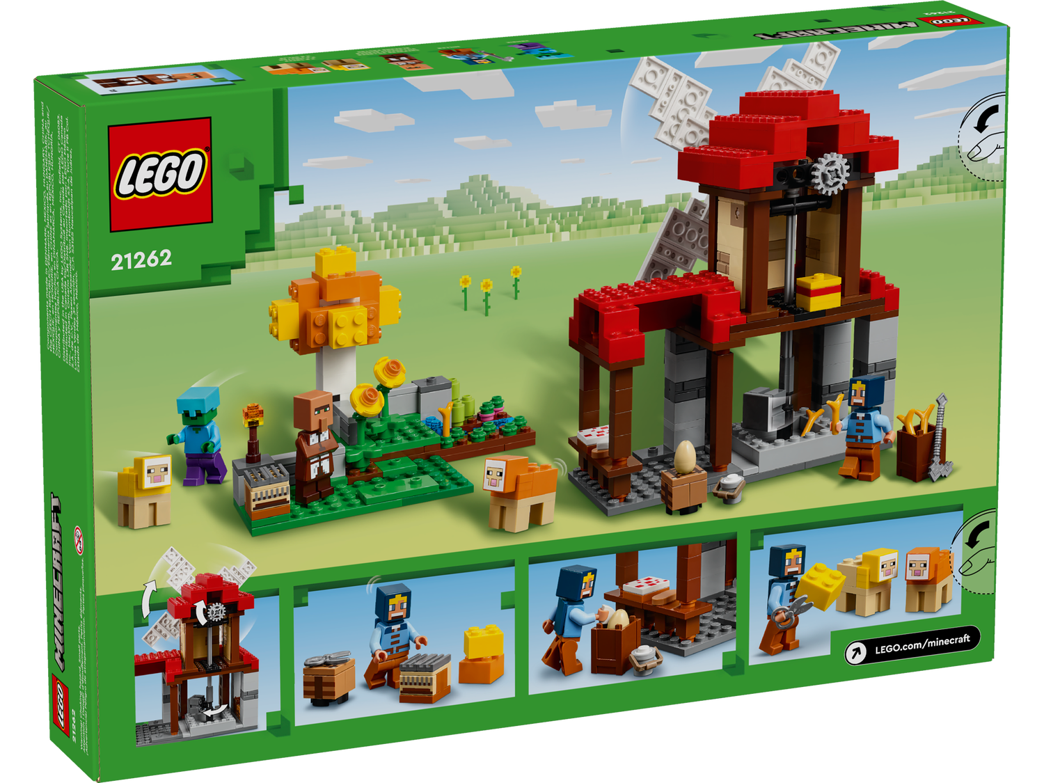 Die Windmühlenfarm (21262) bietet Kindern, die Spielzeug zu Videospielen lieben, jede Menge Minecraft® Action mit einem Zombie und Farmtieren. Du suchst das beste Minecraft Spielzeug für ein Kind ab 8 Jahren? Dann ist dieses Set mit all seinen LEGO® Minecraft Modellen und Charakteren genau das richtige Geschenk.Dieses Bauspielzeug für Kinder beinhaltet eine funktionierende LEGO Windmühle, die man mithilfe des Rads auf der Rückseite drehen lassen kann, damit der Mühlstein rotiert und Weizenkörner mahlt. Eier, Milch und Zucker sind vorhanden, damit Kinder Brot und Kuchen backen können. Im Obergeschoss der Windmühle befindet sich ein Speicher für Heu und andere Vorräte. Neben dem Müller ist auch ein Schäfer im Set enthalten, der das gelbe und das orange Schaf schert. Auch ein Webstuhl lädt zum Spielen ein. Mit den Wollresten kann man den Baum schmücken. Neben der Mühle befindet sich ein Acker, auf dem Kinder Weizen, Zuckerrohr und Rote Bete anbauen können. Dort draußen lauert aber auchein Zombie! Außerdem bietet die intuitive LEGO Builder App den Baumeistern zusätzlichen digitalen Bauspaß.