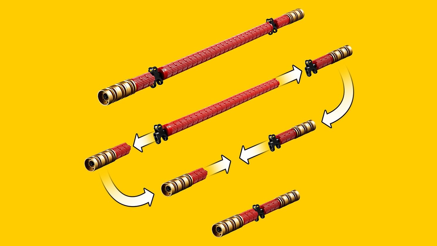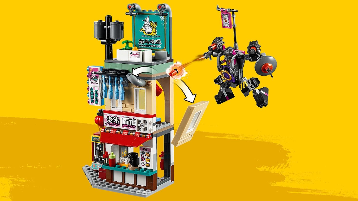 * Es gibt jede Menge Elemente, die zum Spielen anregen, darunter der riesige Stab des LEGO® Spielzeug-Mechs, der sich verlängern lässt, der Shooter am Bull Clone Mech, Monkie-Kids™ Zimmer über dem Laden sowie ein Arcade-Spielautomat als Baumodell.