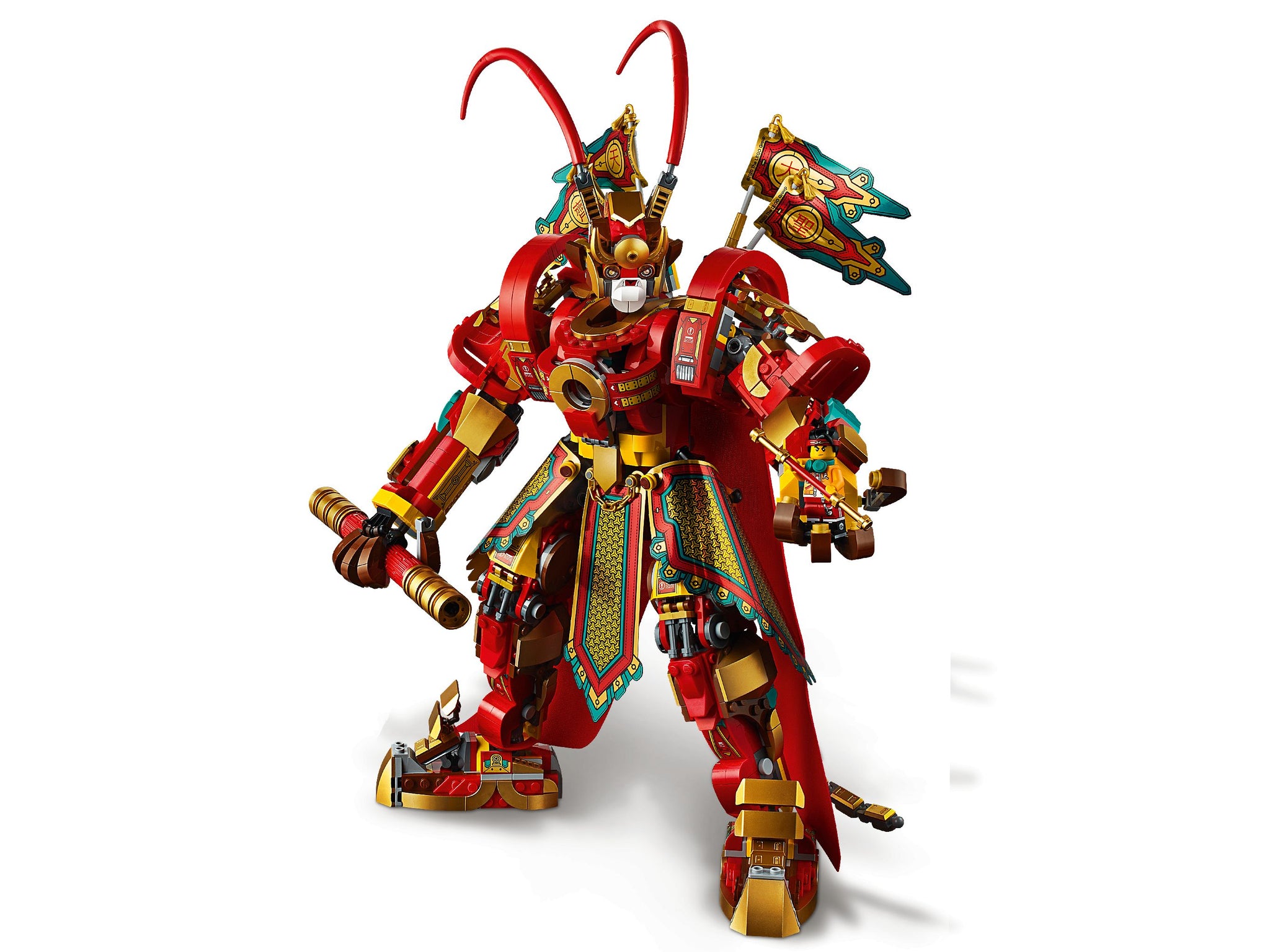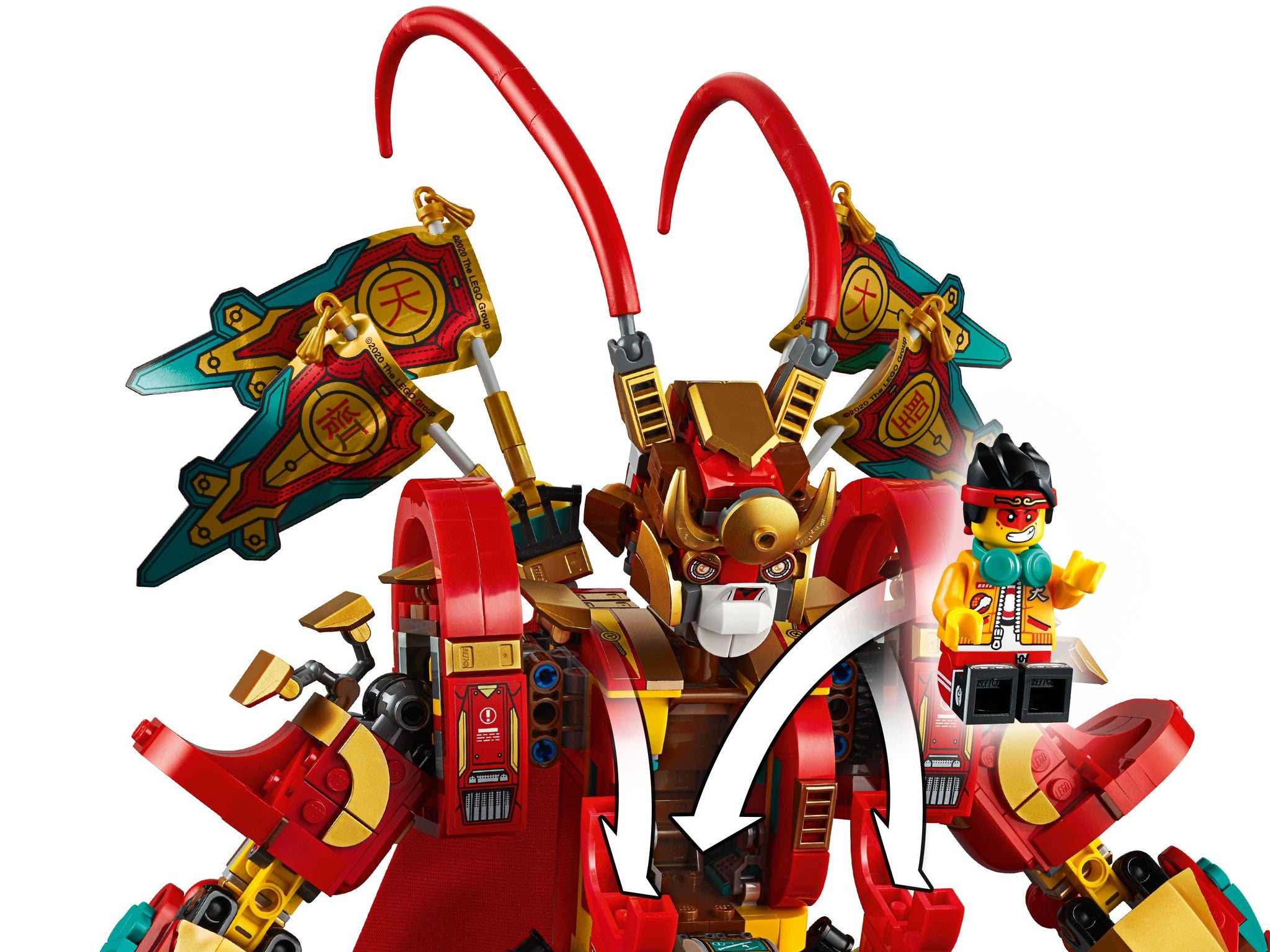 * Der LEGO® Monkey King Mech ist 40 cm hoch, 23 cm lang und 42 cm breit und lässt sich wunderbar mit anderen LEGO® Monkie Kid™ Bauspielzeugen kombinieren, um noch mehr Actionspaß zu bieten.