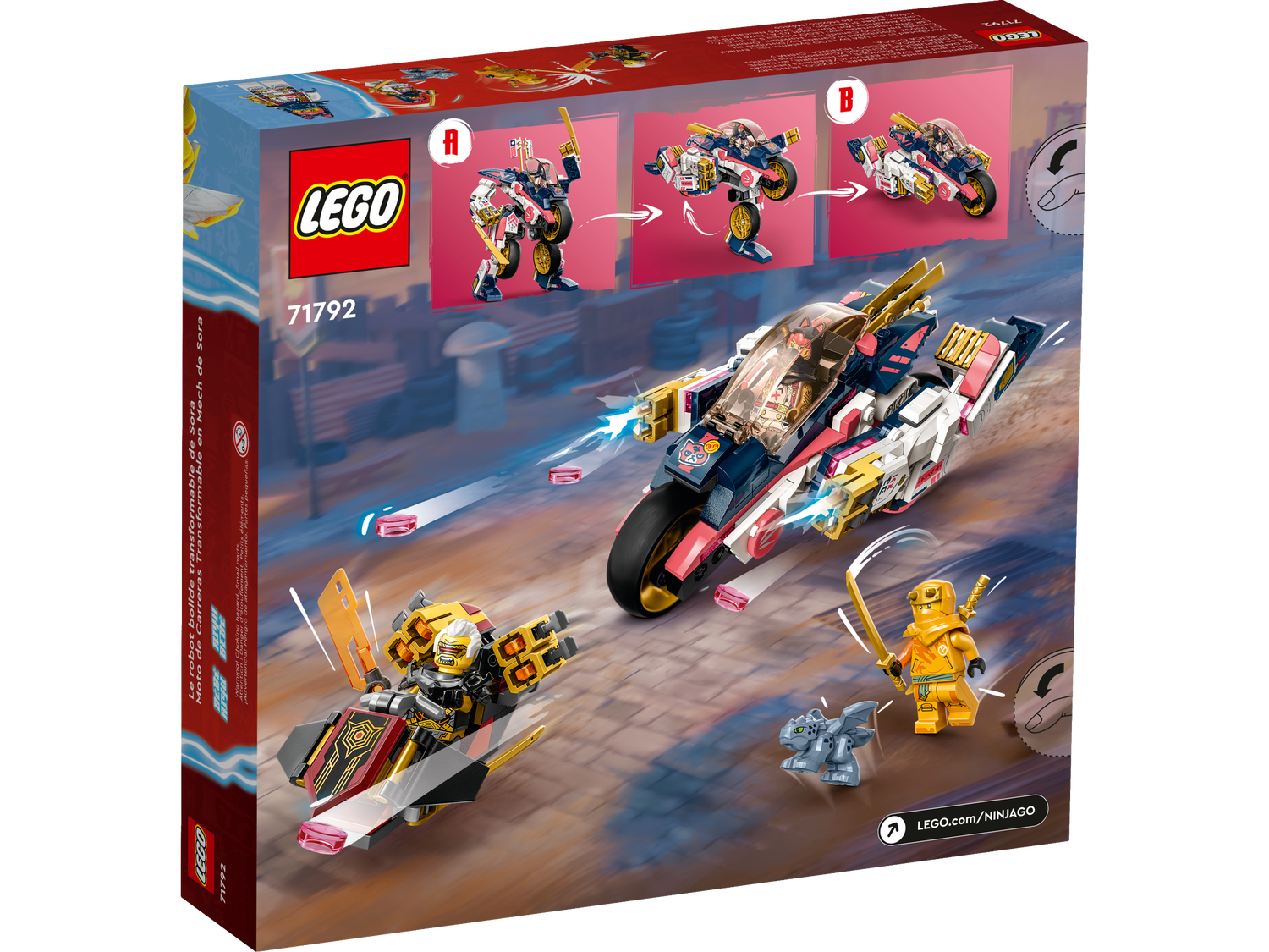 Soras Mech-Bike (71792) ist ein Spielset mit allem, was Kinder ab 8 Jahren brauchen, um rasante Actionszenen aus der TV-Serie NINJAGO® Dragons Rising nachzustellen. Das Spielset beinhaltet einen beweglichen Mech, den man mühelos in ein aufgemotztes Ninja-Bike mit goldenen Klingen und 2 Shootern verwandeln kann.Beste Bauspielzeuge für Ninja-FansDas Spielset beinhaltet 3 Minifiguren: die Ninja-Schüler Arin und Sora, den Drachenjäger Rapton sowie das Drachenbaby Riyu. Arin schwingt ein Katana und einen Enterhaken, und Sora hat 2 Katanas. Gemeinsam müssen sie Rapton bezwingen, der ein kaiserliches Schwert schwingt und auf einem Gleiter mit 2 Shootern fliegt. Dieses Set lädt dein Kind zu stundenlangen Rollenspielen mit seinen Ninja-Helden ein.Faszinierendes digitales Bauerlebnis für LEGO FansDie LEGO Builder App begleitet dich und dein Kind auf ein leichtes und intuitives Bauabenteuer. Vergrößere und drehe 3D-Ansichten der Modelle, speichere Sets und verfolge deinen Baufortschritt.
