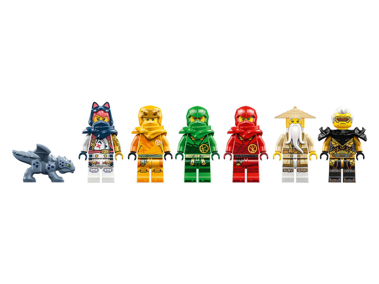 Der Ninja-Flugsegler im Wettlauf mit der Zeit (71797) ist genau das richtige Spielset, um Ninja-Fans ab 9 Jahren spannende Actionszenen mit dem modernisierten Luftschiff darstellen zu lassen. Der legendäre Flugsegler ist jetzt ein Luftschiff, mit dem die Ninja über die neu verschmolzene Welt schweben. An Bord befindet sich ein Drache, der im Bug nistet. Außerdem verfügt das Luftschiff über bewegliche Segel, Shooter am Heck und um 360 Grad drehbare Triebwerke. Das Dach kann man abnehmen, um den Navigationsraum und das Spielzimmer mit einem Spielautomaten preiszugeben.Cooles KinderspielzeugDieses Premium-Spielset beinhaltet ein Modell von Baby Riyu sowie 6 Minifiguren: Meister Wu mit seinem Stab, Arin mit einem Enterhaken, Sora, Lloyd und Kai, die jeweils ein goldenes Katana schwingen, sowie Rapton mit einem kaiserlichen Schwert und seinem eigenen Enterhaken. Mit diesen tollen Minifiguren können fantasievolle Kinder packende Szenen aus der TV-Serie NINJAGO® Dragons Rising nachstellen.Faszinierendes digitales Bauerlebnis für LEGO® FansDie LEGO Builder App begleitet dich und dein Kind auf ein leichtes und intuitives Bauabenteuer. Vergrößere und drehe 3D-Ansichten der Modelle, speichere Sets und verfolge deinen Baufortschritt.