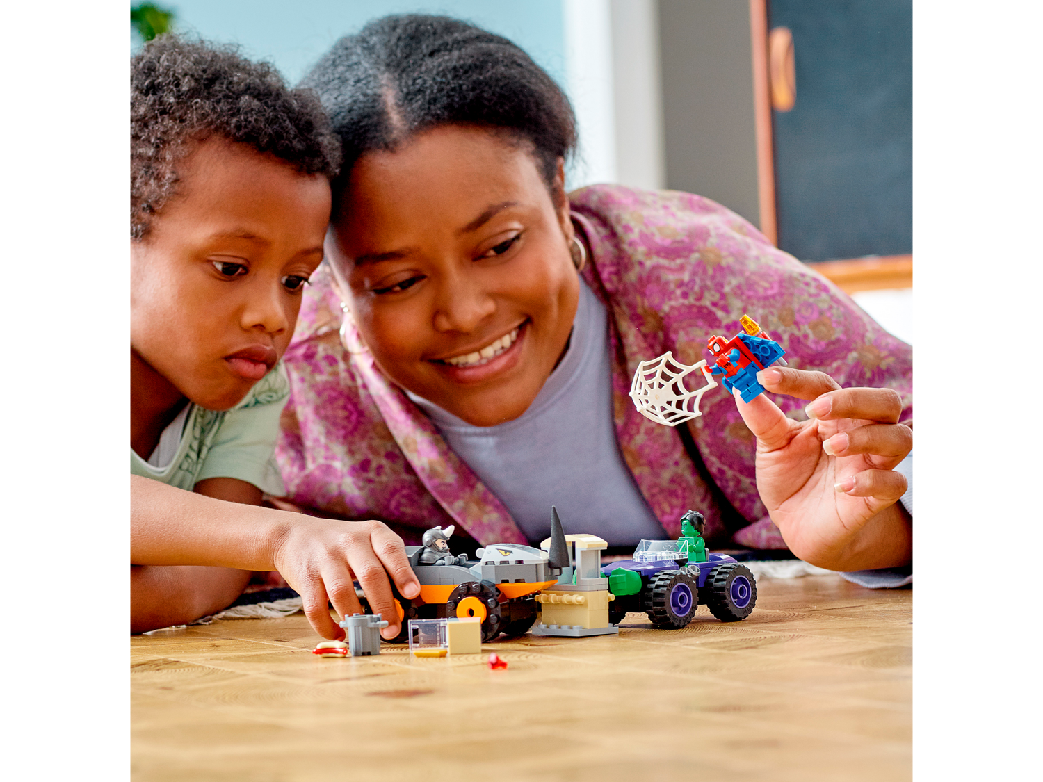 Das LEGO® Marvel Bauspielzeug „Spidey und seine Super-Freunde – Hulks und Rhinos Truck-Duell“ (10782) lässt Superhelden ab 4 Jahren die Welt retten. Kinder können die packenden Szenen aus der beliebten TV-Serie auf Disney+ nachstellen und Spidey und Hulk helfen, Rhinos Banküberfall zu vereiteln. Kinder werden die Actionfahrzeuge aus diesem Set zum Bauen, Spielen und Sammeln lieben. Das Rammhorn an Rhinos Fahrzeug und die mächtigen Fäuste an Hulks Truck eignen sich perfekt für heftige Zusammenstöße.Bauen kinderleicht gemacht4+ Spielsets lassen Kinder rasch bauen. Dank der beiden fertigen Truckfahrgestelle können die Kinder gleich spielen. Sie müssen nicht erst das ganze Set fertig bauen, denn jeder Beutel enthält die Steine für ein Modell und einen Charakter. Einfache Bildanleitungen erleichtern das Ganze, damit auch Kinder, die gerade erst lesen lernen, die Modelle bauen können. Erwachsene können aber gerne mitmachen und ihre Bauerfahrung weitergeben, um kleine Spider-Man-Fans in echte Baumeister zu verwandeln.