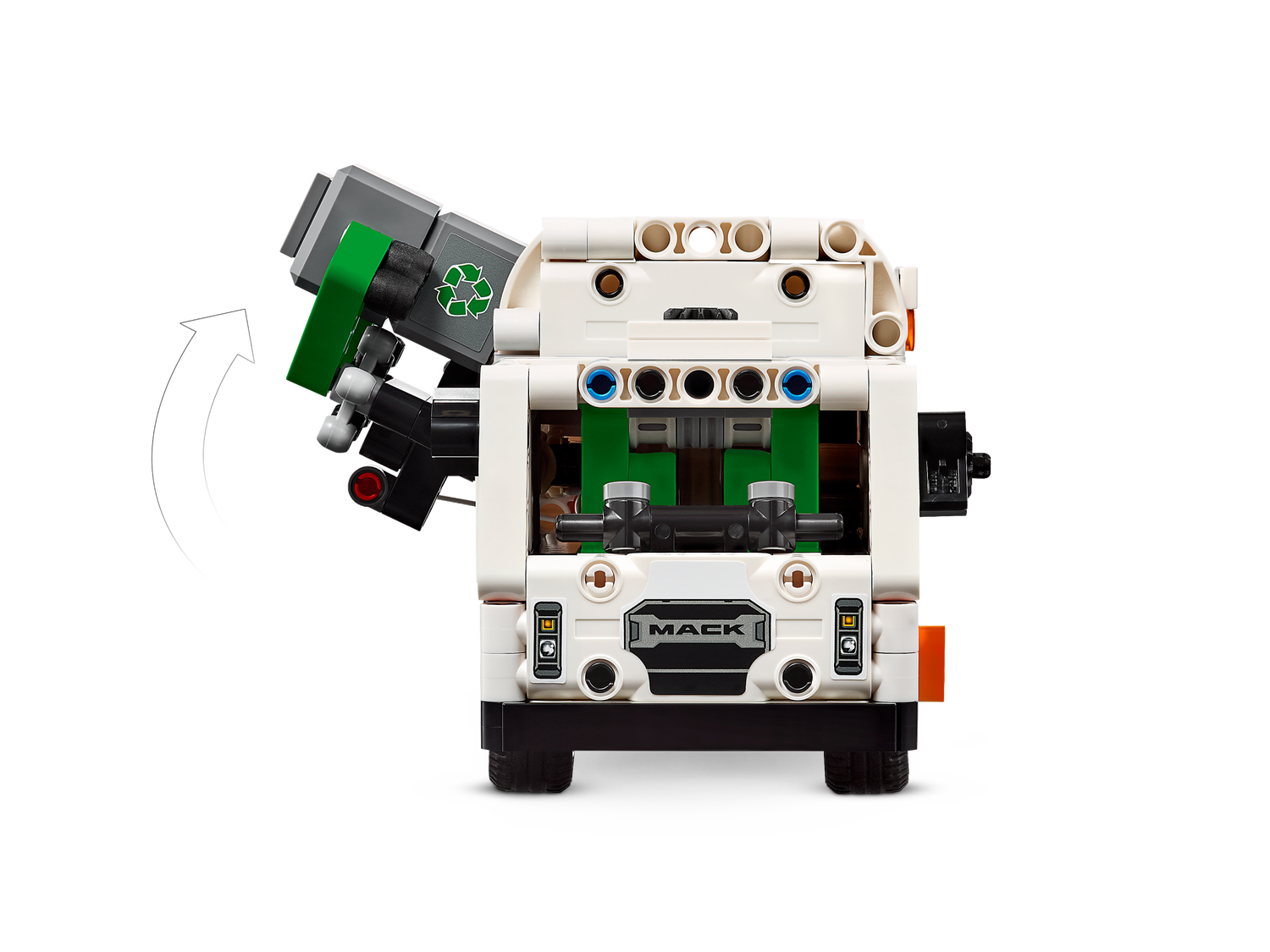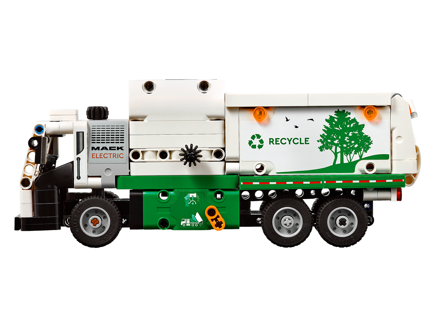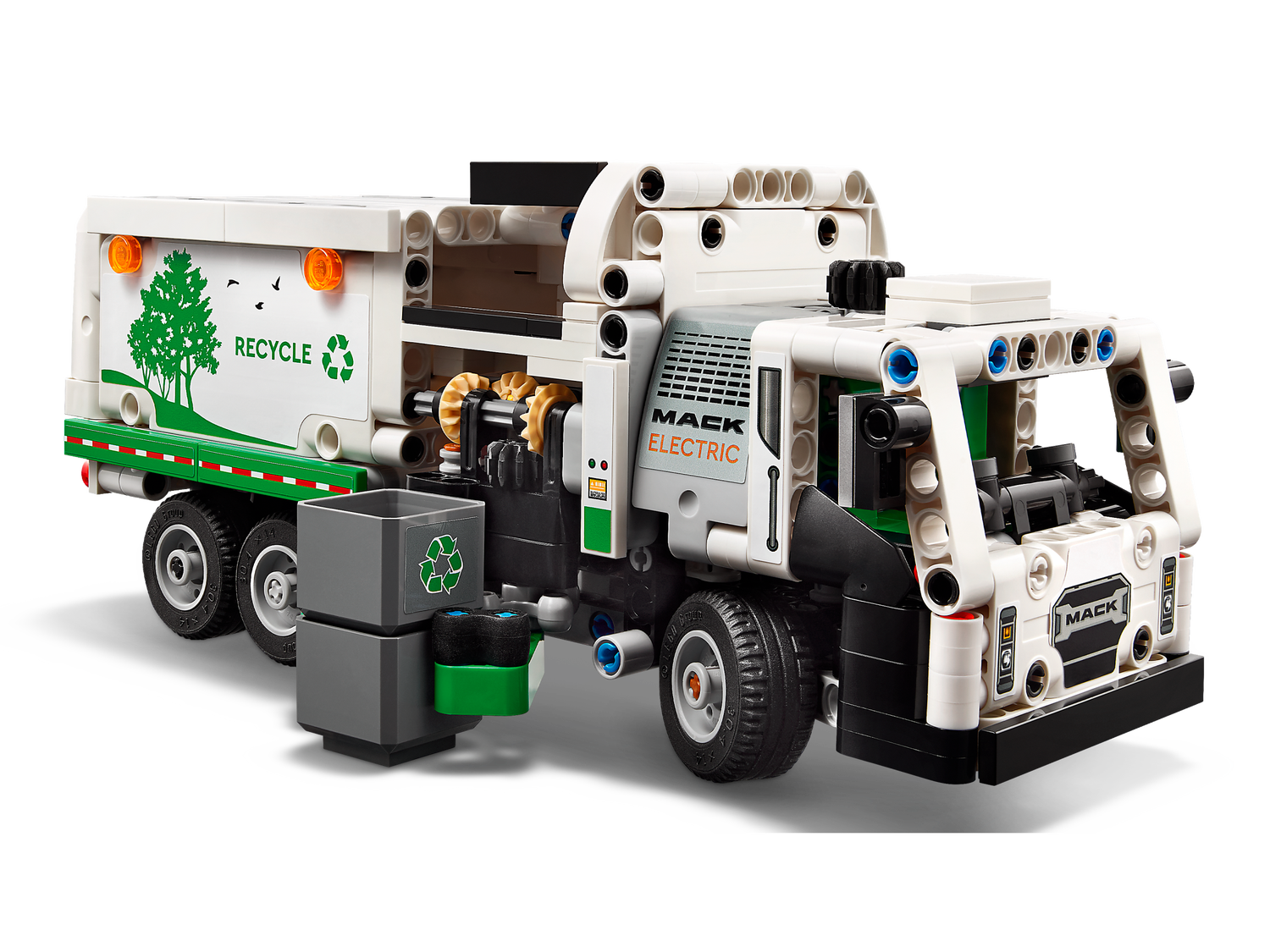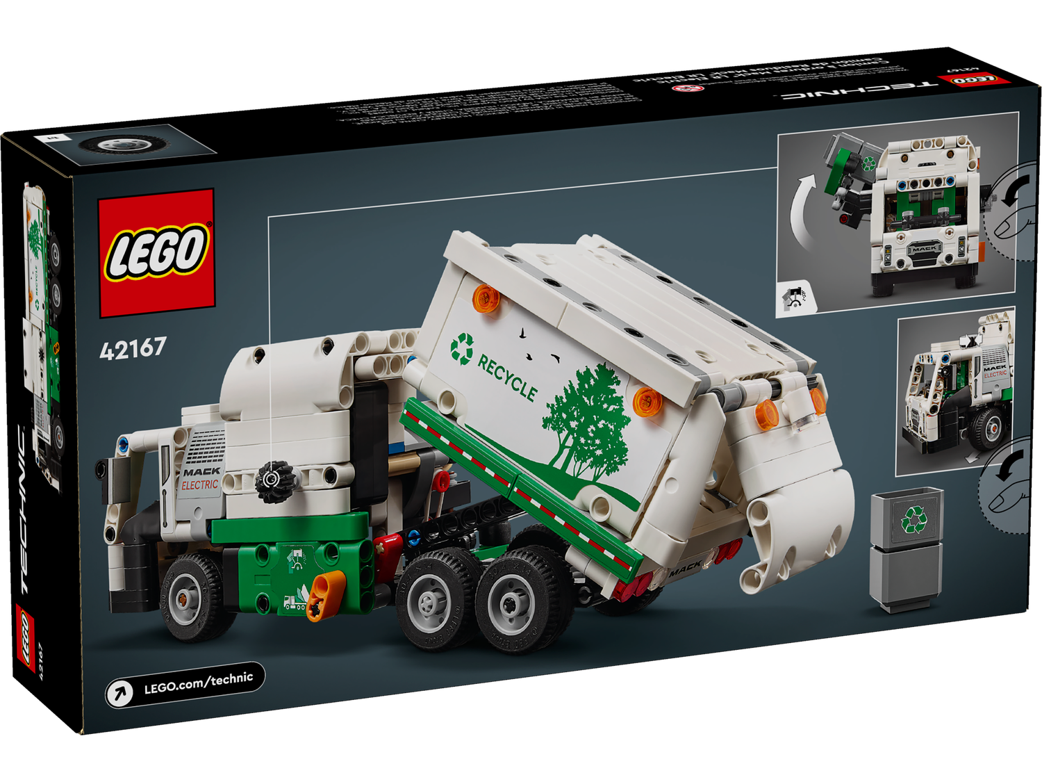 Dieser LEGO® Technic Mack® LR Electric Müllwagen (42166) für Jungen und Mädchen ab 8 Jahren lässt Kinder, die Fahrzeuge lieben, über saubere Energie nachdenken, während sie den Müll abholen. Diesem Spielzeug-Recyclingauto mit originalgetreuen Bewegungen und Funktionen diente der echte Mack Elektro-Müllwagen als Vorbild.Wenn dein Kind das Modell gebaut hat, kann es kreativ mit dem Müllwagen spielen und erkunden, was das Fahrzeug alles kann. Dein Kind kann die Türen öffnen und das Zahnrad oben auf der Kabine drehen, um den Müllwagen in die richtige Position zu lenken. Genau wie das echte Fahrzeug verfügt auch dieses Modell über einen Seitenlader, der Mülltonnen greifen, anheben und entleeren kann. Dein Kind kann so tun, als würde es Müll wegfahren und abladen. Das Set beinhaltet auch Mülltonnen und Abfälle für viele fantasievolle Rollenspiele.LEGO Technic Bausets überzeugen durch realistische Details, die jungen LEGO Baumeisterinnen und Baumeistern technische Konzepte auf verständliche Weise näherbringen. Schick dein Kind mit der LEGO Builder App in ein faszinierendes Bauabenteuer. Mit den enthaltenen Funktionen kann dein Kind digitale 3D-Modellansichten vergrößern und drehen und seinen Baufortschritt verfolgen.